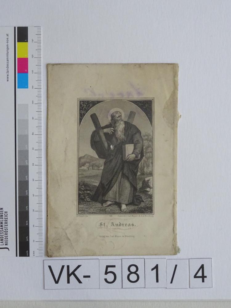 Hl. Andreas; "C. Hoesch gez., Stahlstich von Carl Mayers K.-A. in Nürnberg, Verlag von Carl Mayer in Nürnberg, 282"; Rückseite: "xxx (Name unleserlich) 1872, Kristof 1911"; Eintrag Inventarbuch: "Heiligenbildchen, Heilige: A"