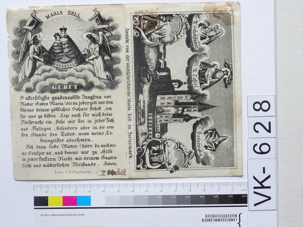 Mariazell; gefaltet; Vorderseite: Gnadenstatue = Maria mit Kinder "S. M. Schatzkammer" (Maria mit Kind), "S. M. Taferl" (Pietà), "S. Dreieinigkeit" (Gnadenstuhl), Basilika; Innenseiten: leer; Rückseite: Gnadenstatue = Maria mit Kind: Maria mit Kind, bekle