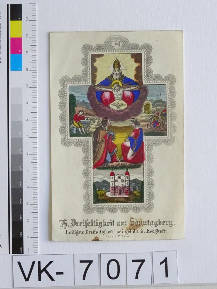 Sonntagberg; Vorderseite: Gnadenbild = Gnadenstuhl, Basilika, Hirte mit Schaf, Reiter, Josef und Maria, "Bei F. Glaser, Linz"; Eintrag Inventarbuch: "Andachtsbild, Stahlstich, Sammlung Klar."