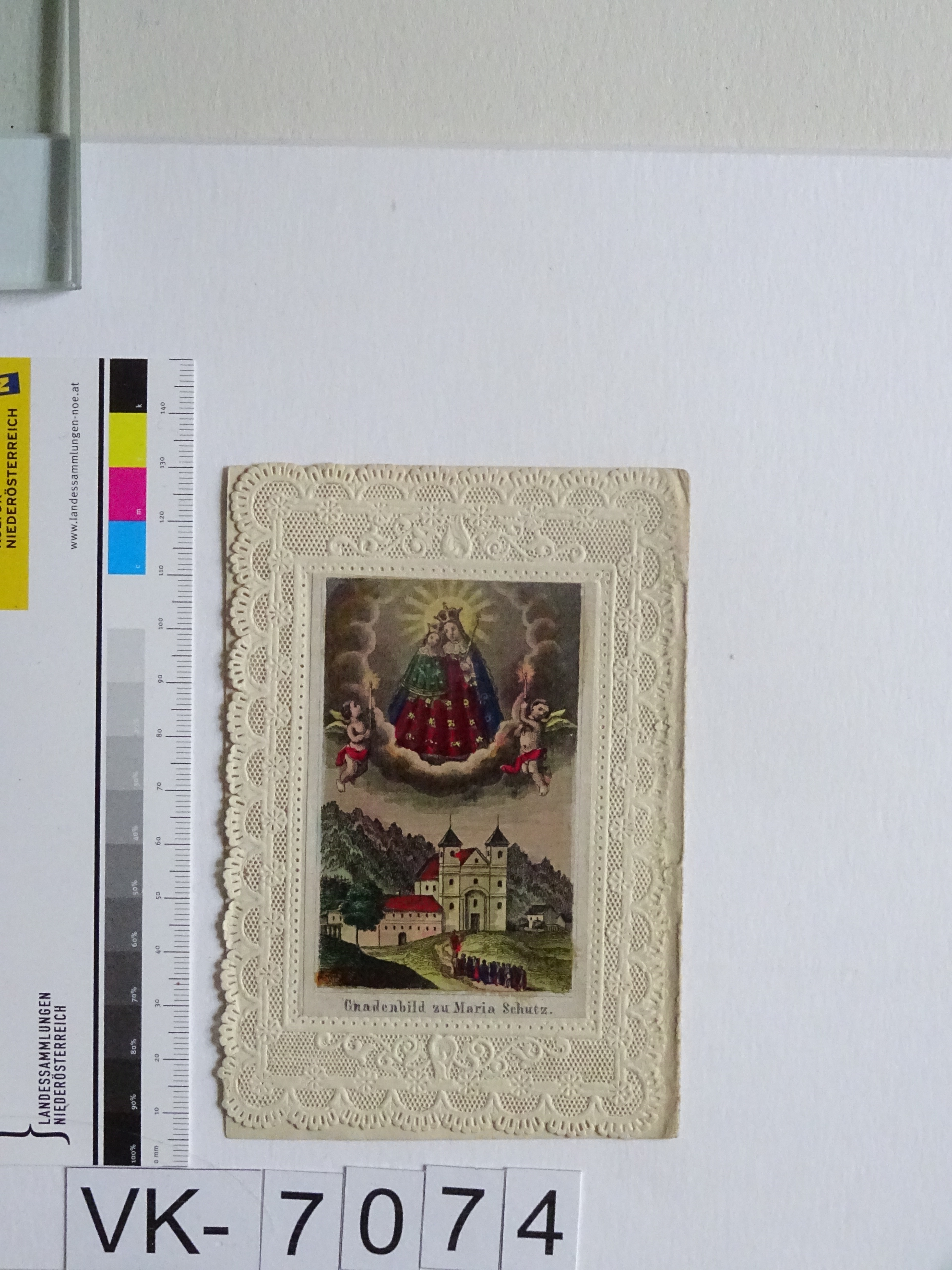 "Maria Schutz" im Semmeringgebiet; gefaltet und verklebt; Vorderseite: Gnadenbild = Maria mit Kind, Wallfahrtskirche; Rückseite: "Gebet zur allerheiligsten Jungfrau Maria"; Eintrag Inventarbuch: "Andachtsbildchen, Slg. Klar."