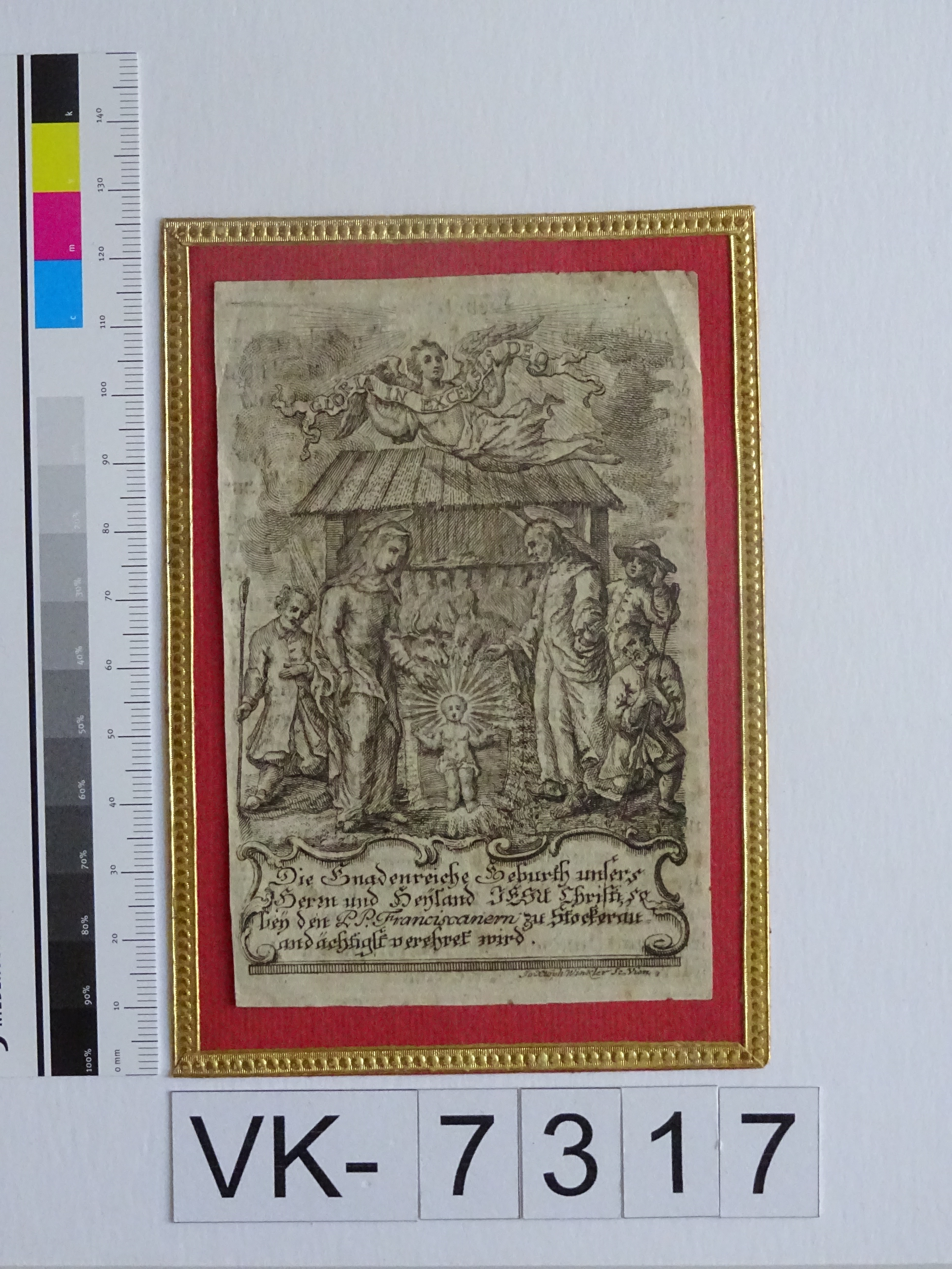 Stockerau, Franziskanerkirche; Geburt Christi; Rückseite: Gebet; verklebt auf Karton; Eintrag Inventarbuch: "Andachtsbild, Kupferstich; Slg. Klar."
