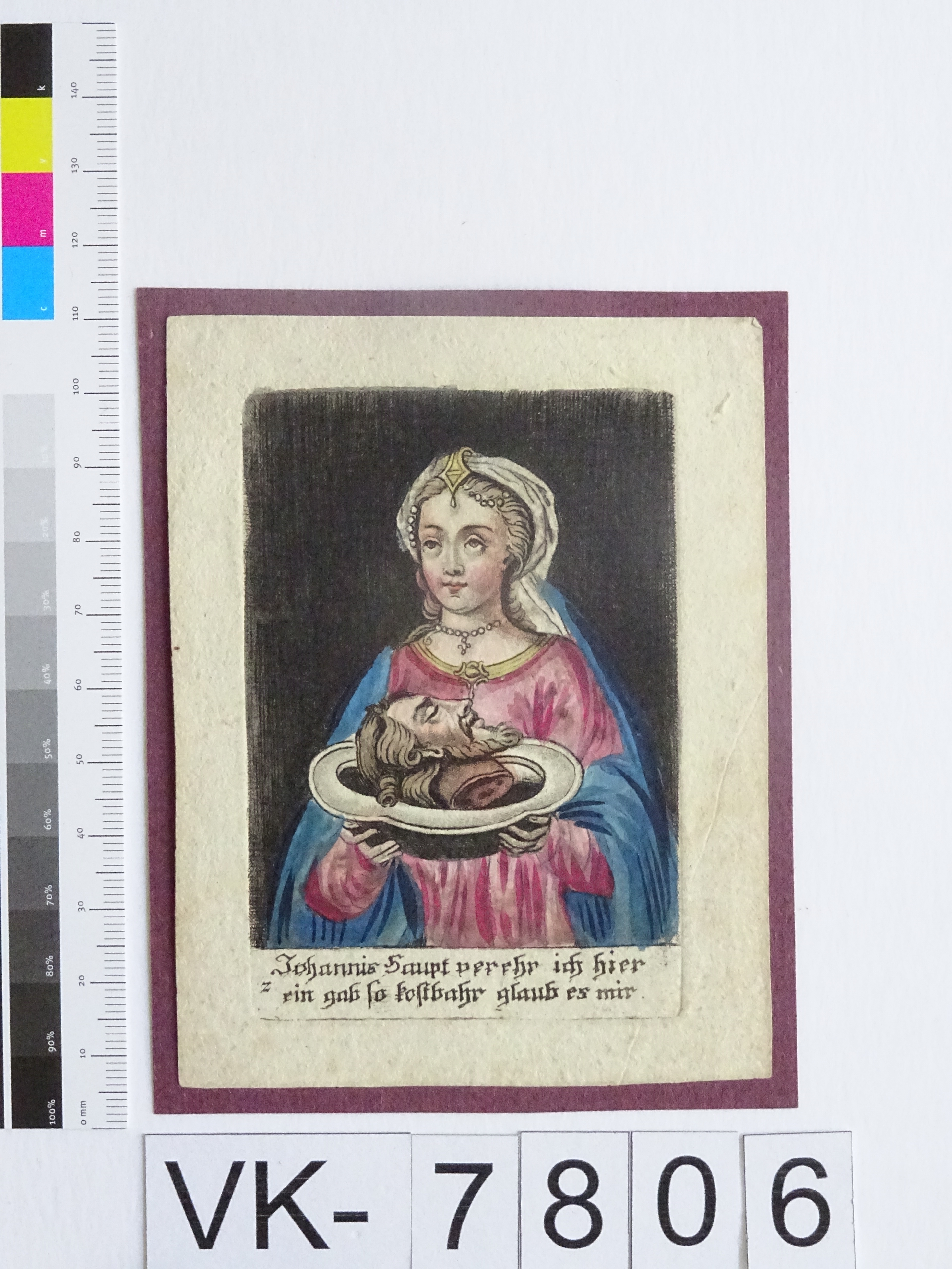 Hl. Johannes, der Täufer; Salome und Haupt des Johannes auf Tablett; verklebt auf Karton; Eintrag Inventarbuch: "Andachtsgrafik, Slg. Stergar."
