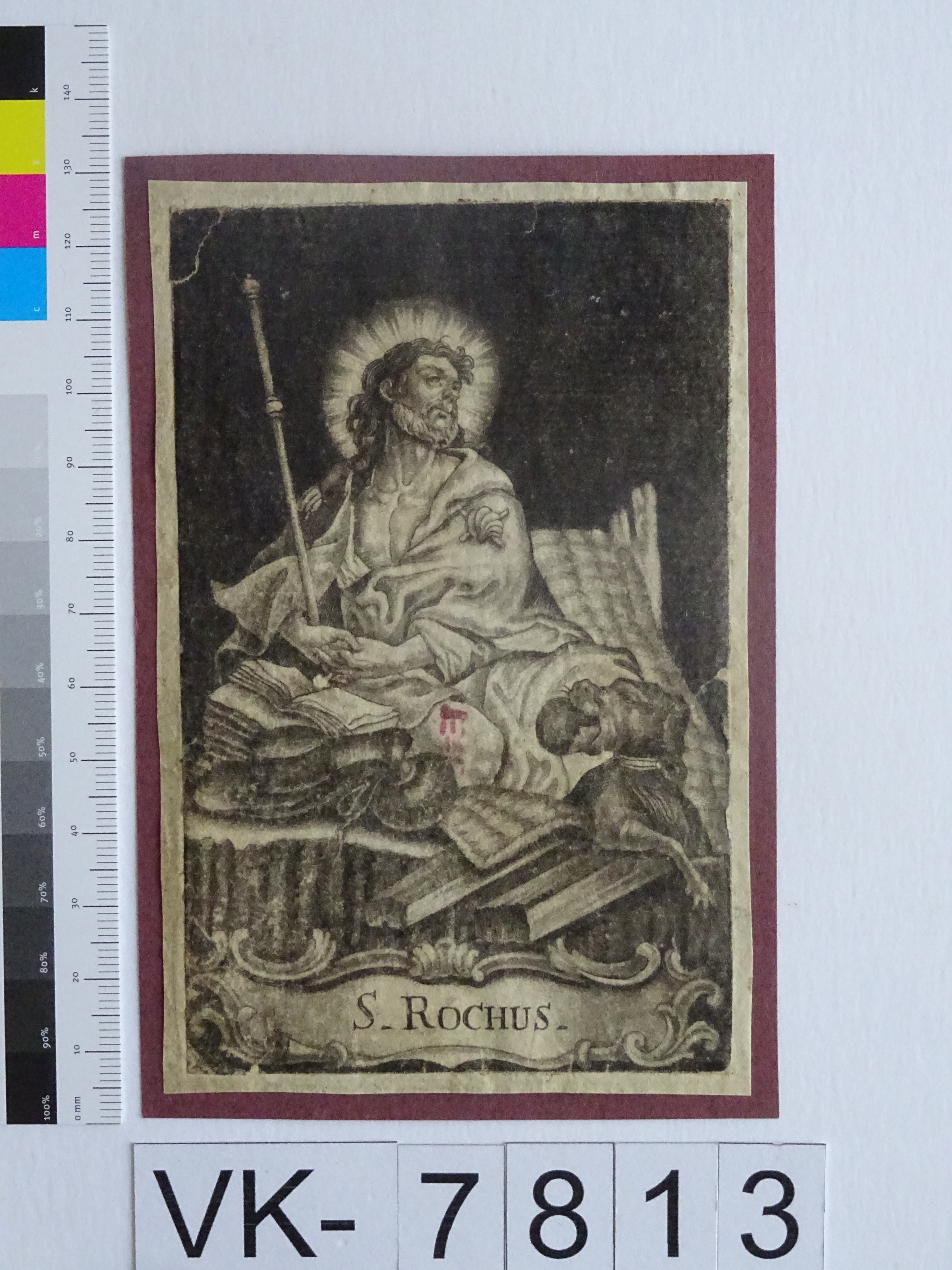 Hl. Rochus; verklebt auf Karton; Eintrag Inventarbuch: "Andachtsgrafik, Sammlung Stergar."