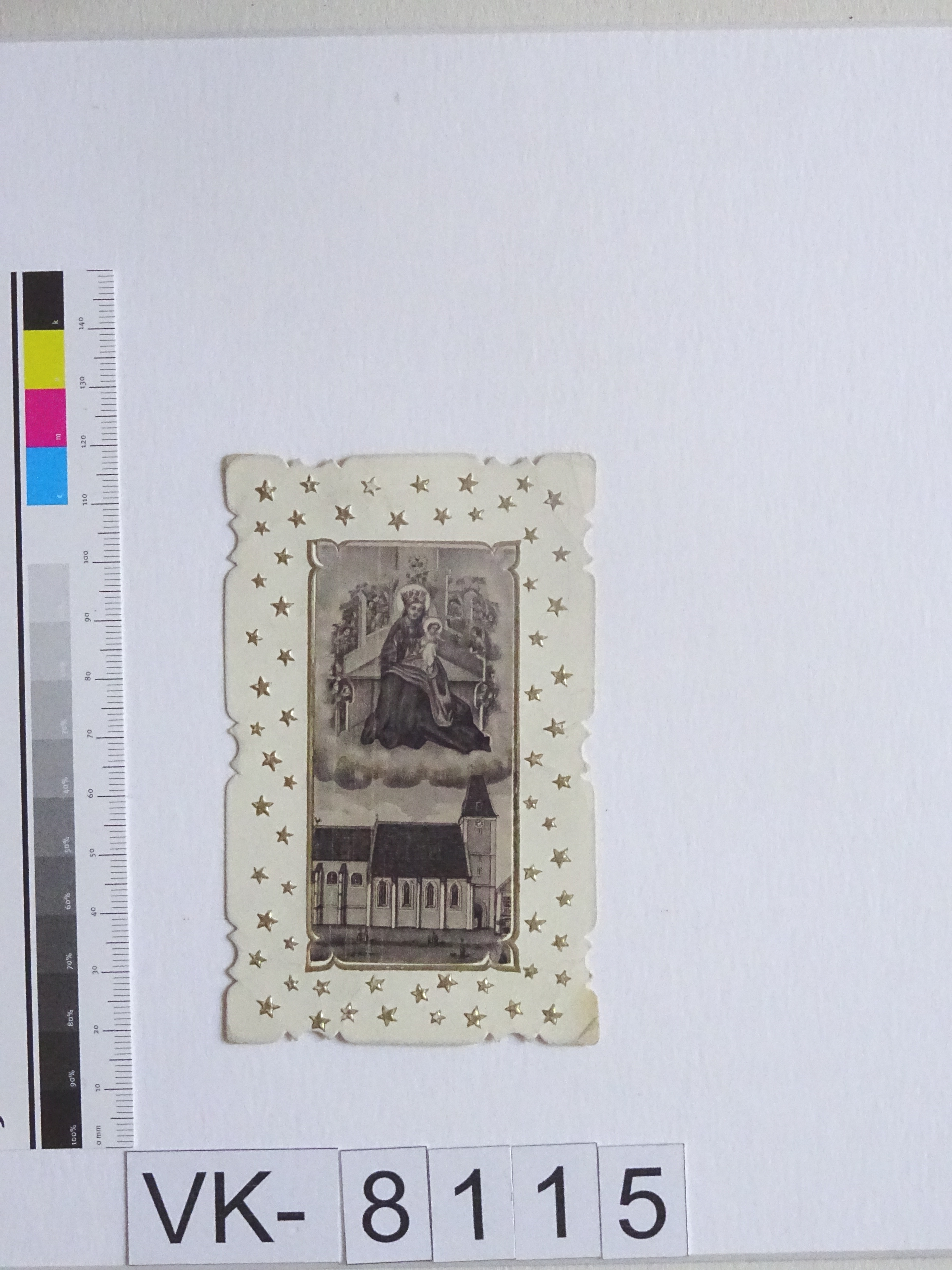 Maria Laach am Jauerling, Unserer Lieben Frau sechs Finger; Vorderseite: Gnadenstatue = Maria mit Kind, Wallfahrtskirche, Sterne; Rückseite: Gebet, "P. J. Strasser", handschriftlich "von Mutter, von Vater"; Eintrag Inventarbuch: "Gebetszettel, Sammlung Kl