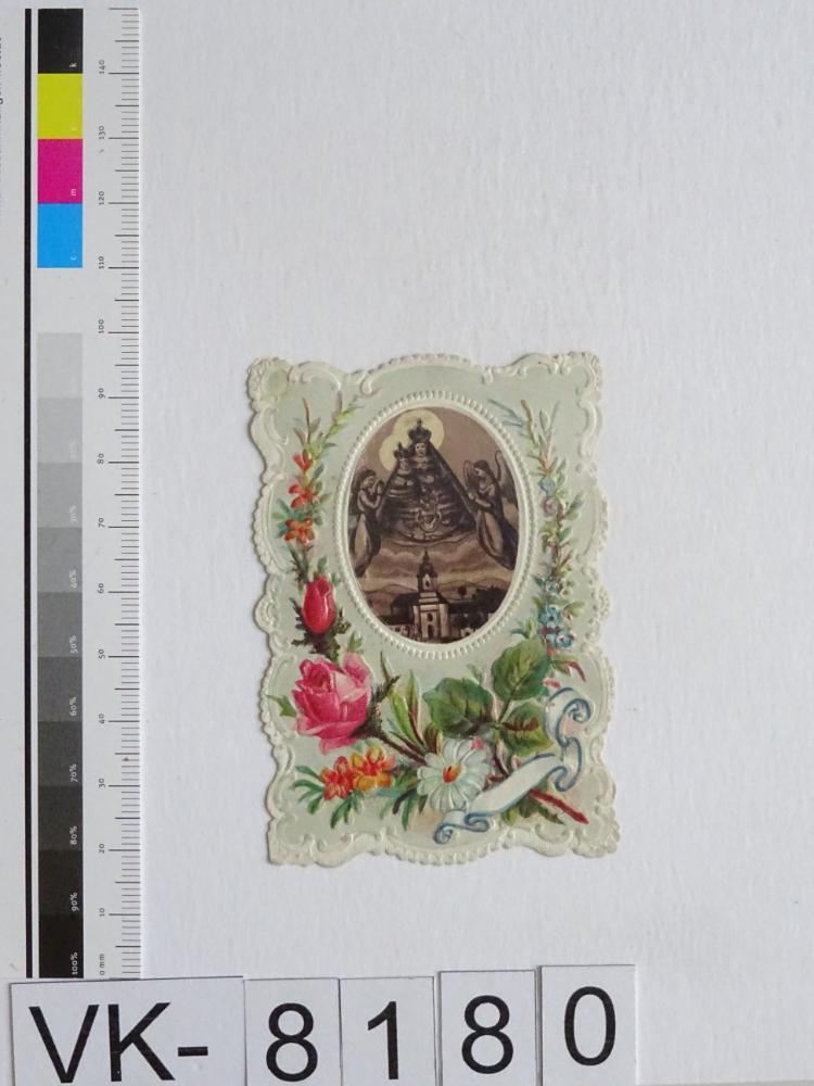 Maria Enzersdorf, "Maria Heil der Kranken"; Vorderseite: Gnadenstatue = Maria mit Kind, Wallfahrtskirche; Rückseite: Gebet; Eintrag Inventarbuch: "Gebetszettel, Slg. Klar."