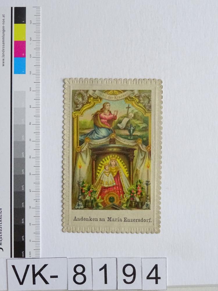 Maria Enzersdorf, "Maria Heil der Kranken"; Vorderseite: Gnadenstatue = Maria mit Kind, Maria Magdalena (Büßerin); Rückseite: Gebet "Gnadenreiche Mutter Jesu"; Eintrag Inventarbuch: "Gebetszettel, Slg. Klar."