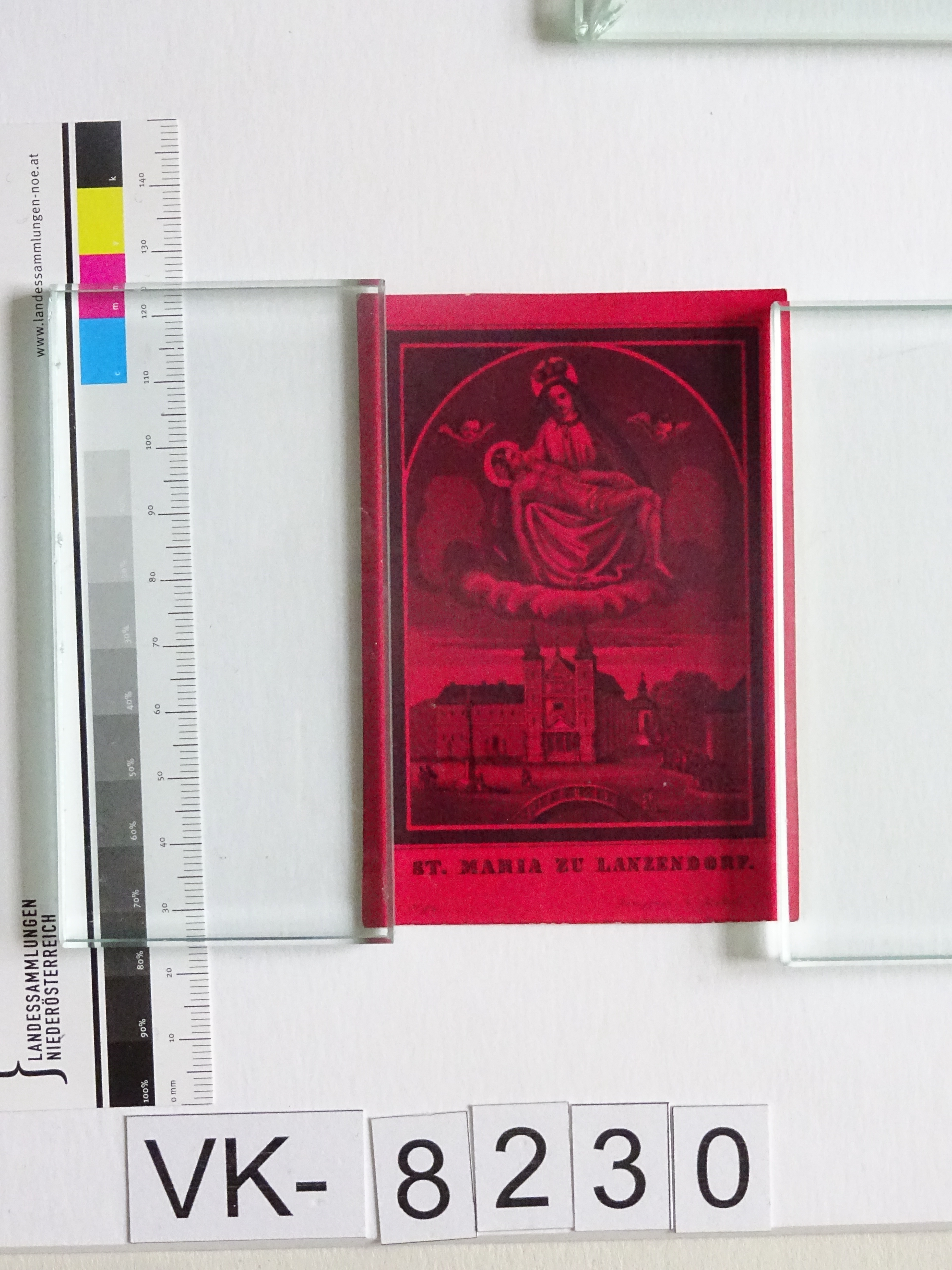 Maria Lanzendorf, "Sieben Schmerzen Mariens" Vorderseite: Gnadenstatue = Pietà, Wallfahrtskirche, "Königgräz bei Mahrle"; Eintrag Inventarbuch: "Gebetszettel, Slg. Klar."
