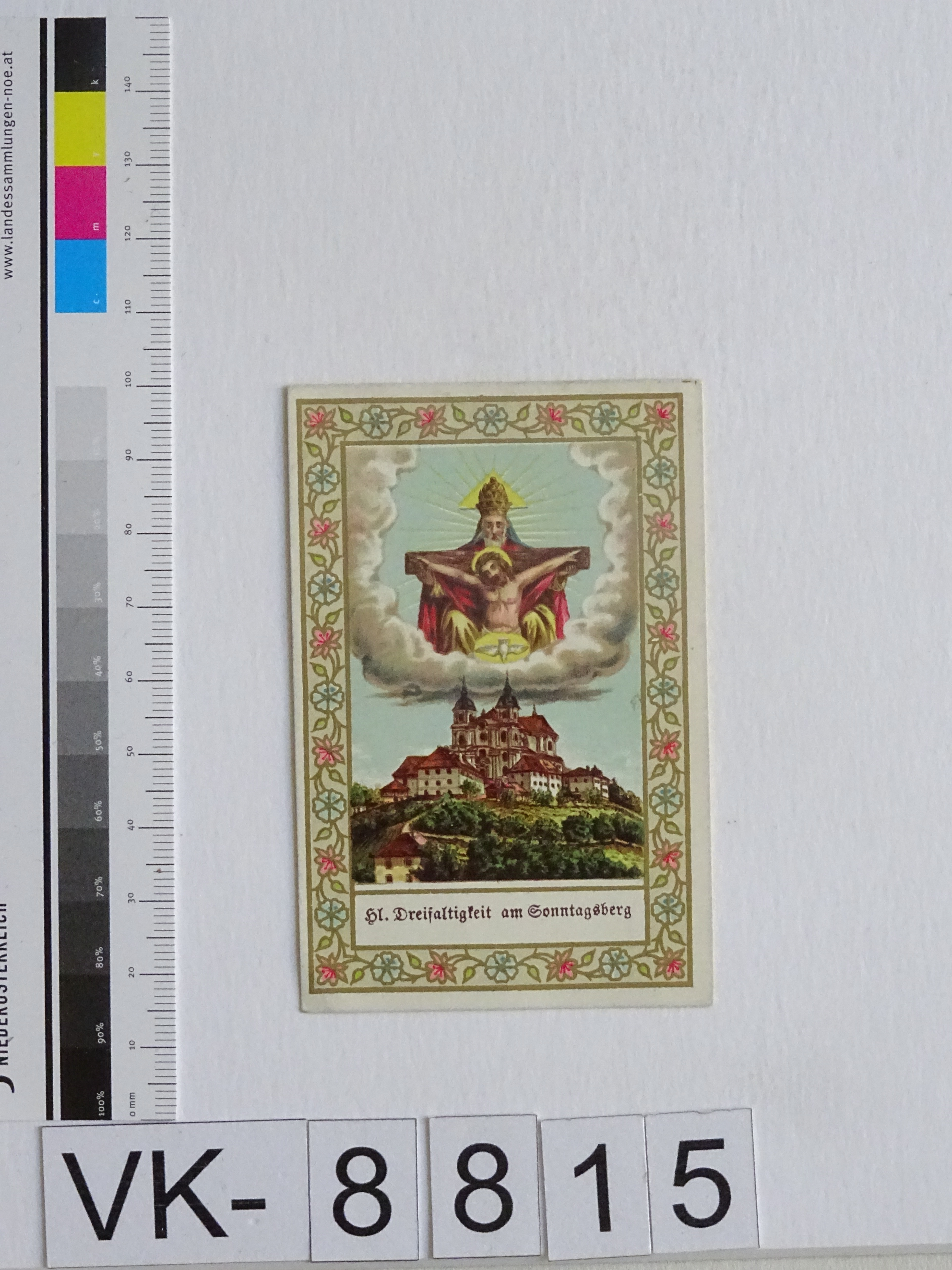 Sonntagberg; Vorderseite: Gnadenbild = Gnadenstuhl, Basilika; Rückseite: "Gebet zur allerheiligsten Dreifaltigkeit"; Eintrag Inventarbuch: "Wallfahrtsbild, Sonntagberg"