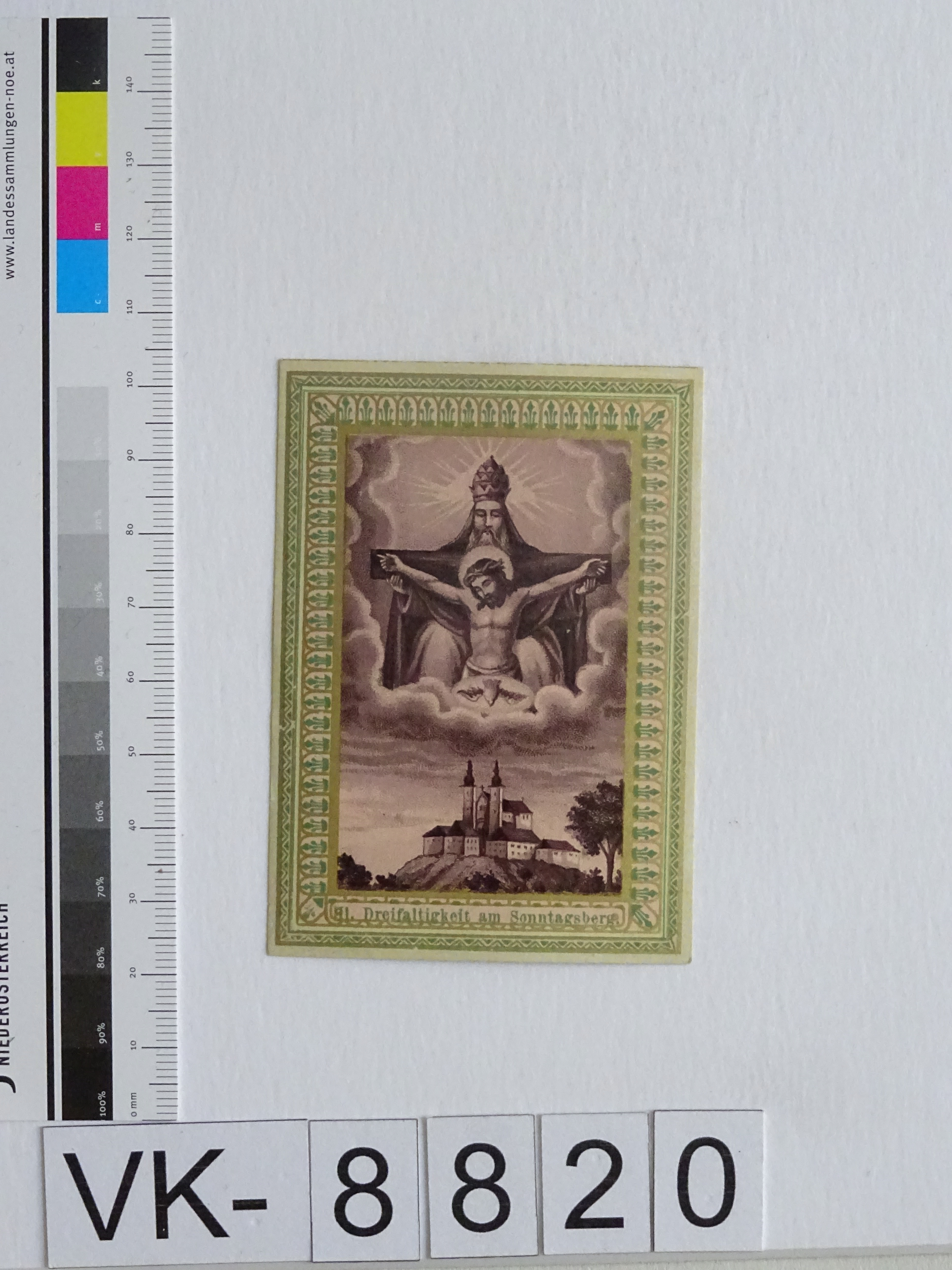 Sonntagberg; Vorderseite: Gnadenbild = Gnadenstuhl, Basilika; Rückseite: "Gebet", "Verlag von G. Fischer, Innsbruck"; Eintrag Inventarbuch: "Wallfahrtsbild, Sonntagberg"