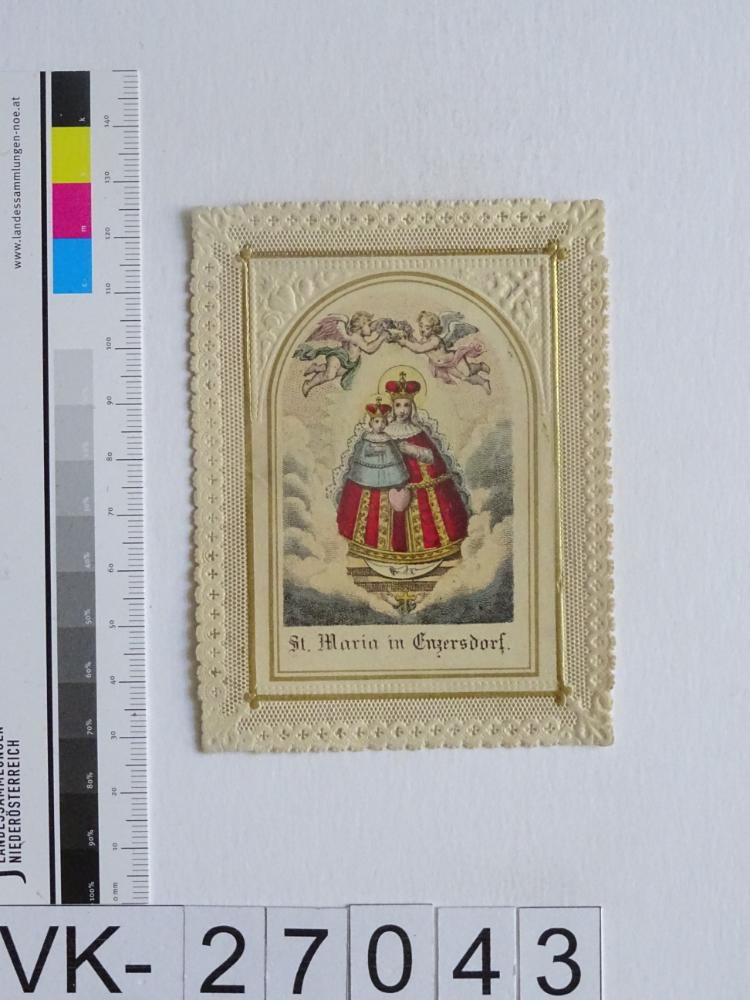 Maria Enzersdorf, "Maria Heil der Kranken"; Vorderseite: Gnadenstatue = Maria mit Kind, Herz; Rückseite: Gebet "Gnadenreiche Mutter Jesu", handschriftlich "Maria xxx (Name unleserlich), Wien den 20. Juli 1874", "Bei A. Schaufele, Stuttgart"