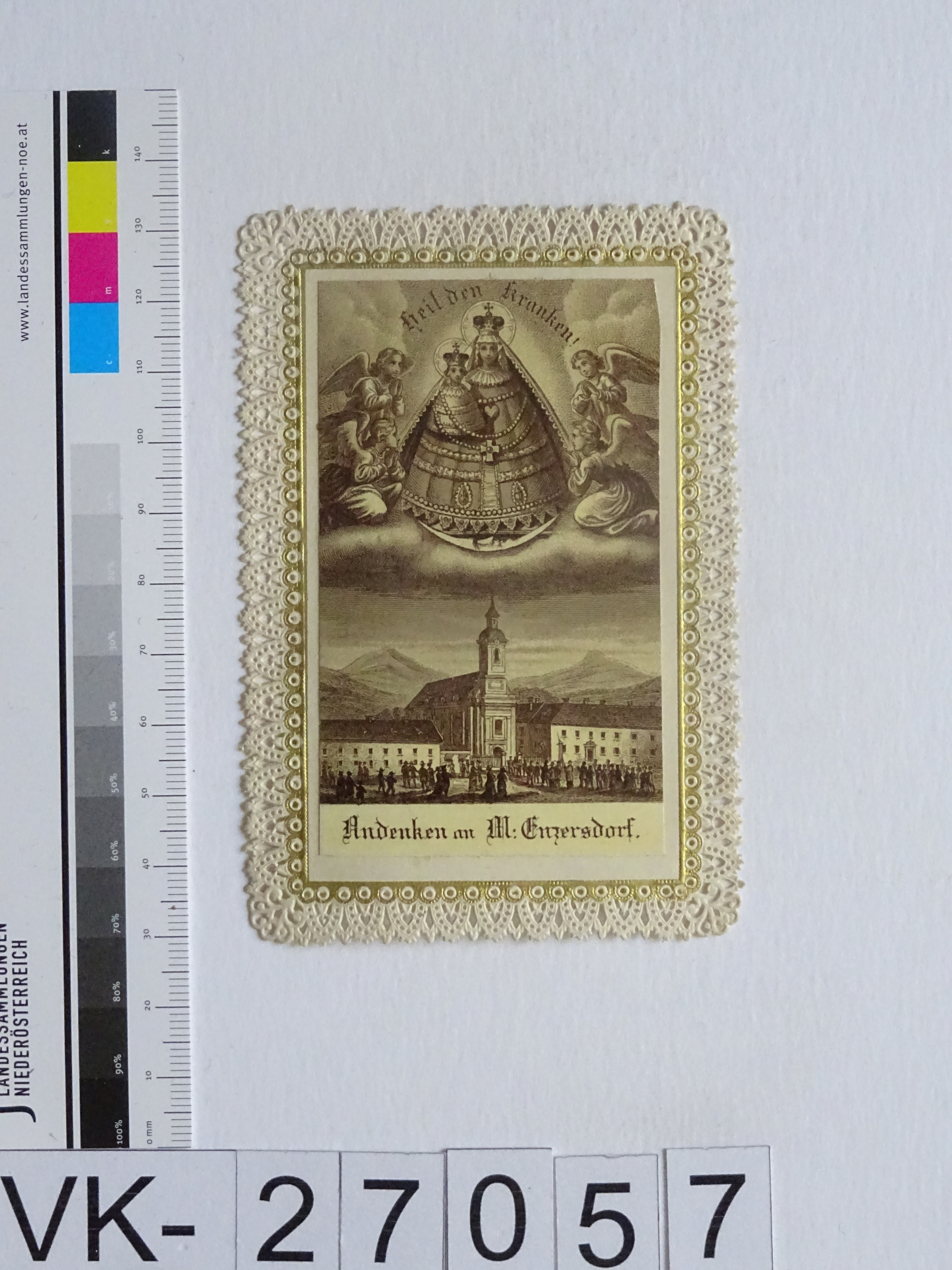 Maria Enzersdorf, "Maria Heil der Kranken"; Vorderseite: Gnadenstatue = Maria mit Kind, Wallfahrtskirche; Rückseite: Gebet "Gnadenreiche Mutter Jesu", "Bei A. Schaufele, Stuttgart"