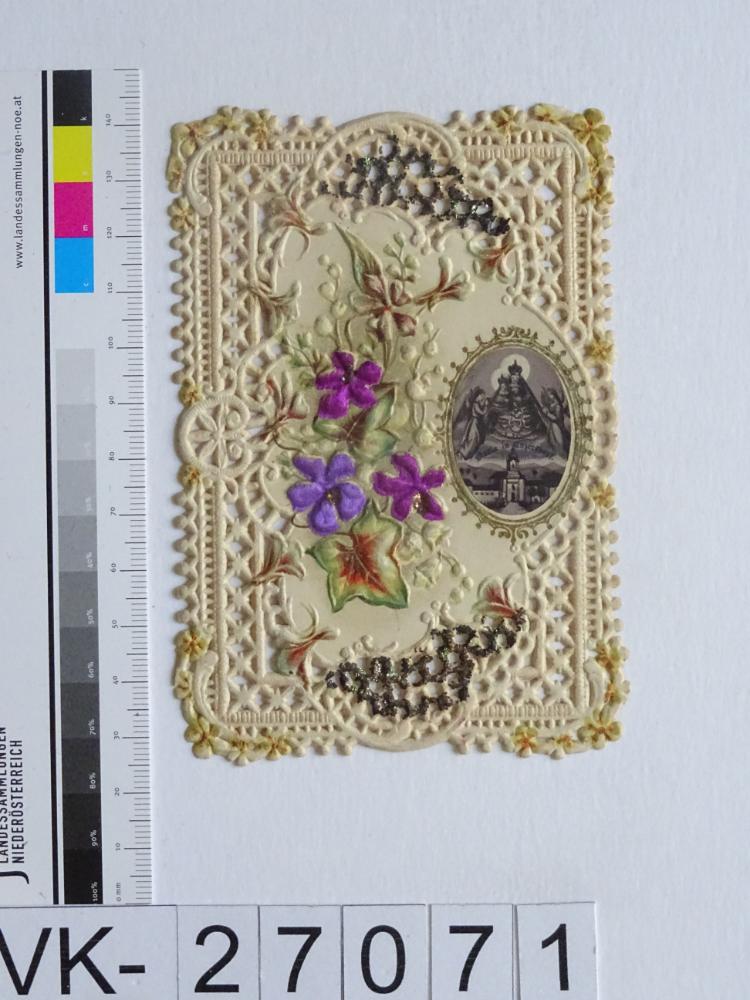 Maria Enzersdorf, "Maria Heil der Kranken"; Vorderseite: Gnadenstatue = Maria mit Kind, Wallfahrtskirche, Blumen (Veilchen, Maiglöckchen)
