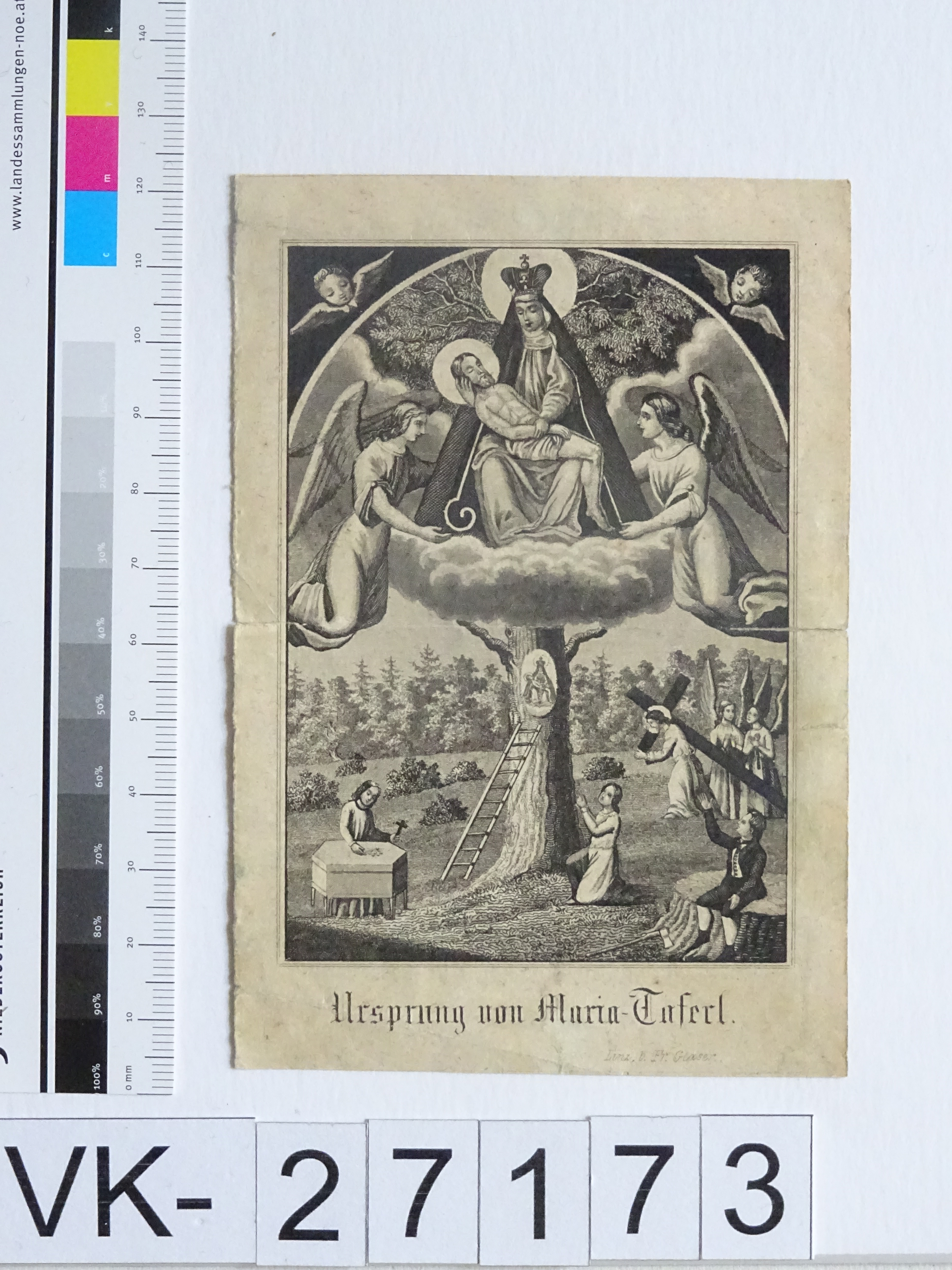 Maria Taferl; Vorderseite: Gnadenstatue = Pietà, Engel, Maria Magdalena betend, Maria Magdalena am Grab Christi, Eiche mit Gnadenbild, Kreuztragung, "b. F. Glaser, Linz"; Rückseite: Gründungsgeschichte "Erinnerung an die zweihundertjährige Jubelfeier des