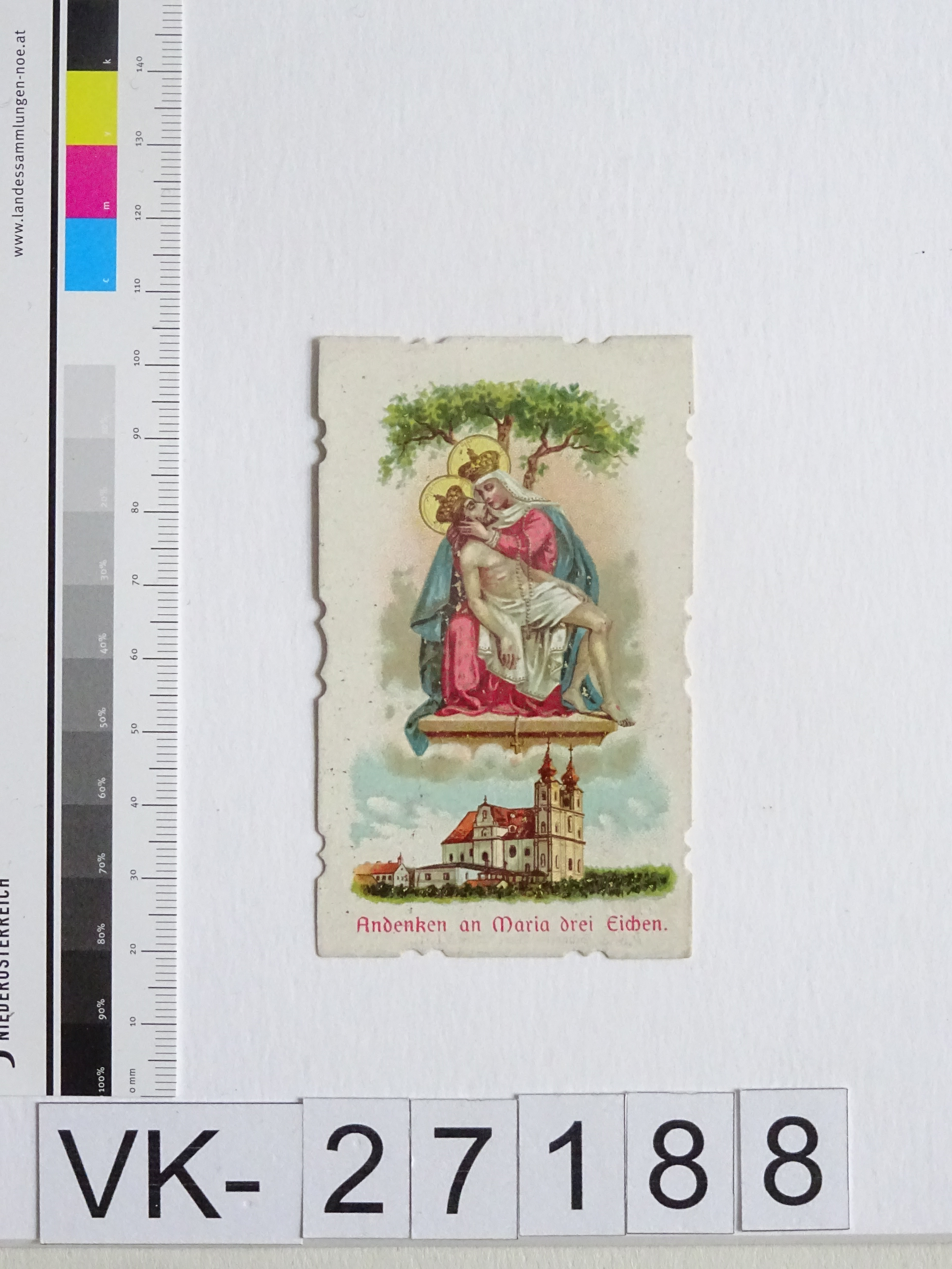 Maria Dreieichen; Vorderseite: Gnadenstatue = Pietà, Basilika; Rückseite: Gebet "Inniger Bittruf zu unseren Lieben Frau", "F. J. Schadek, Wien"