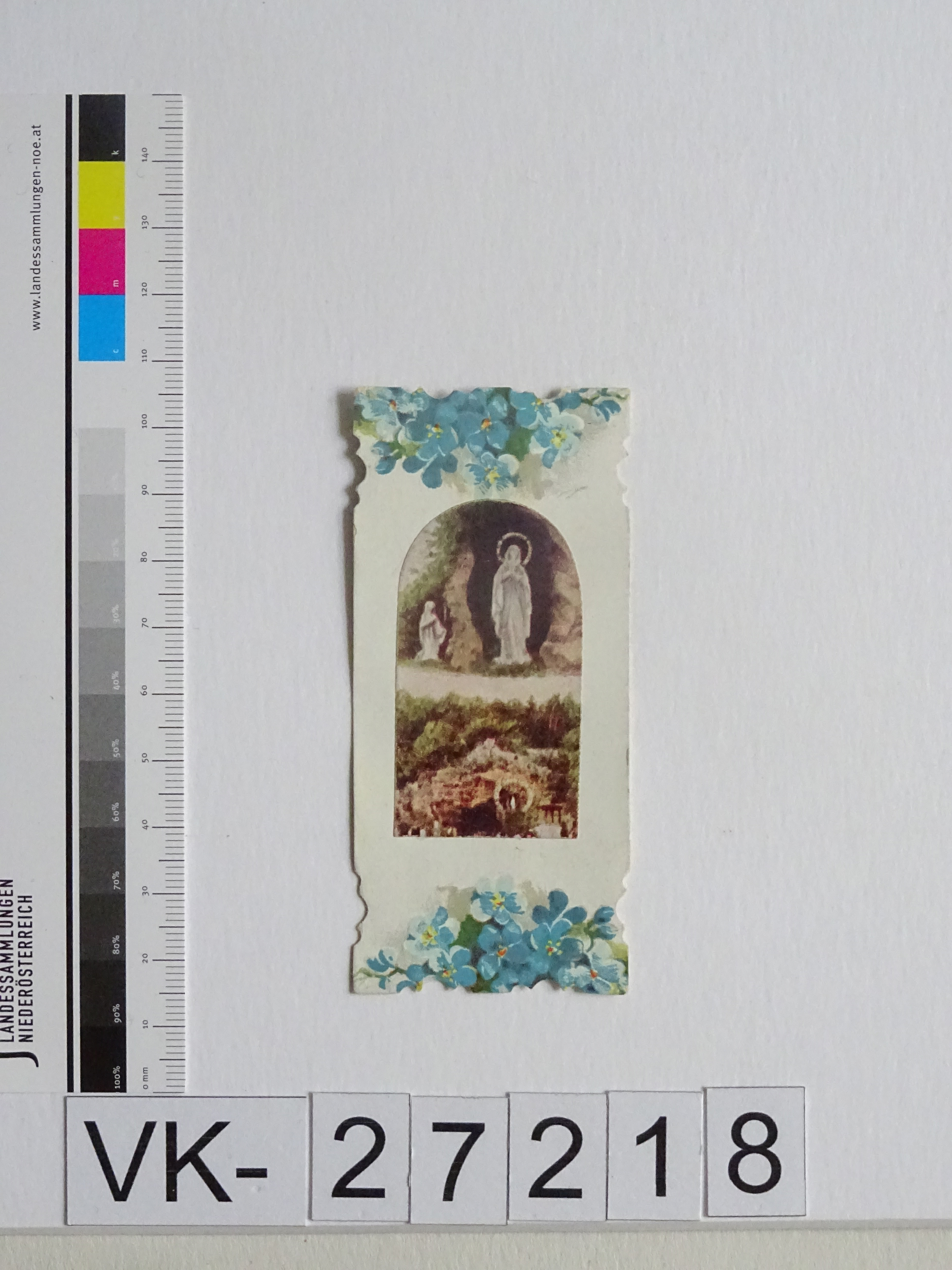 Maria Gugging; Vorderseite: Maria von Lourdes (Lourdesgrotte), Hl. Bernadette Soubirous, Blumen (Vergissmeinnicht); Rückseite: Gebet "Unsere liebe Frau von Lourdes", "J. Peter, Wien"