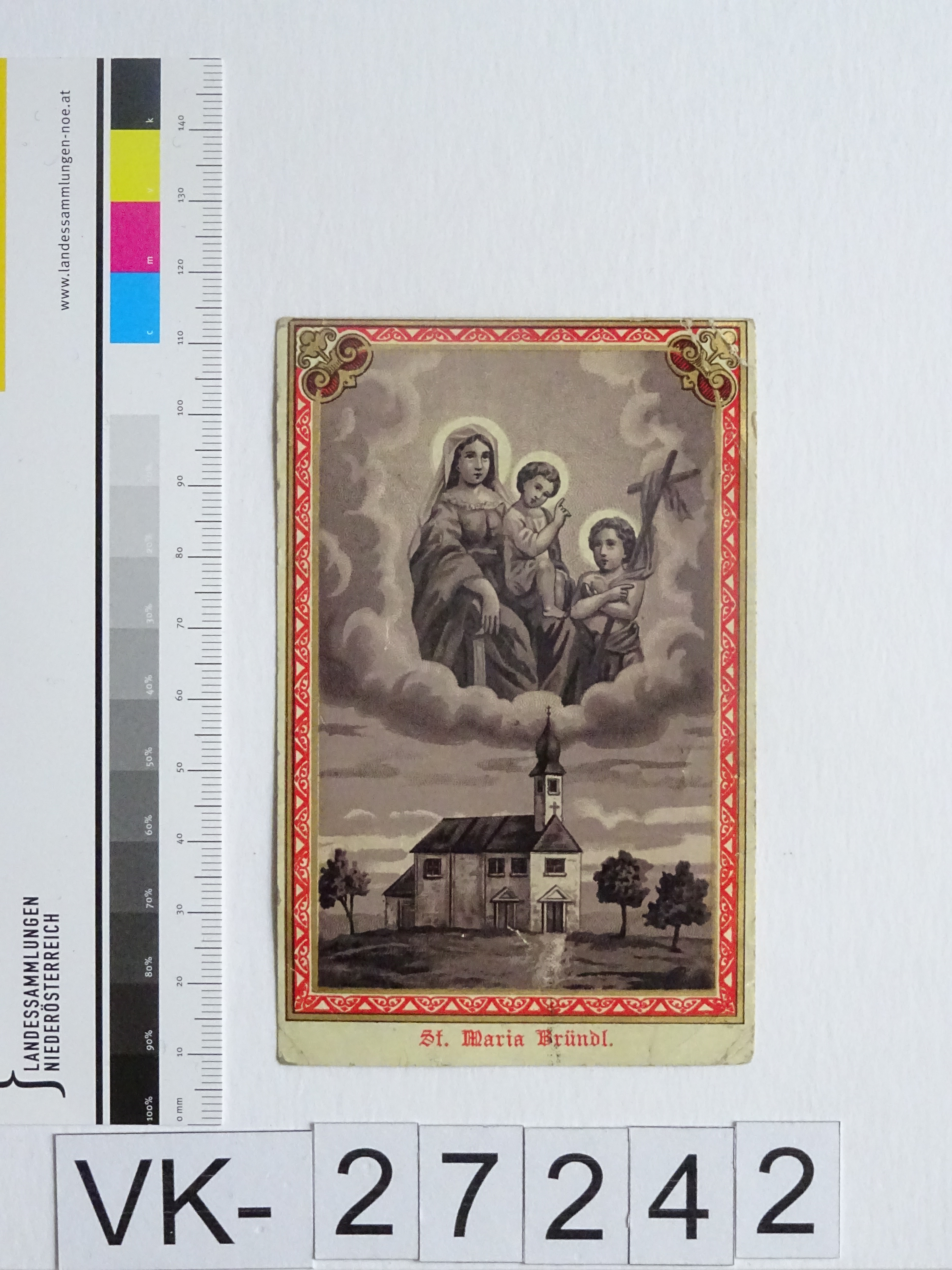Poysdorf, Maria Bründl; Vorderseite: Gnadenbild = Maria mit Kind und Johannesknaben; Rückseite: "Gebet", "Verlag von Gregor Fischer, Innsbruck"