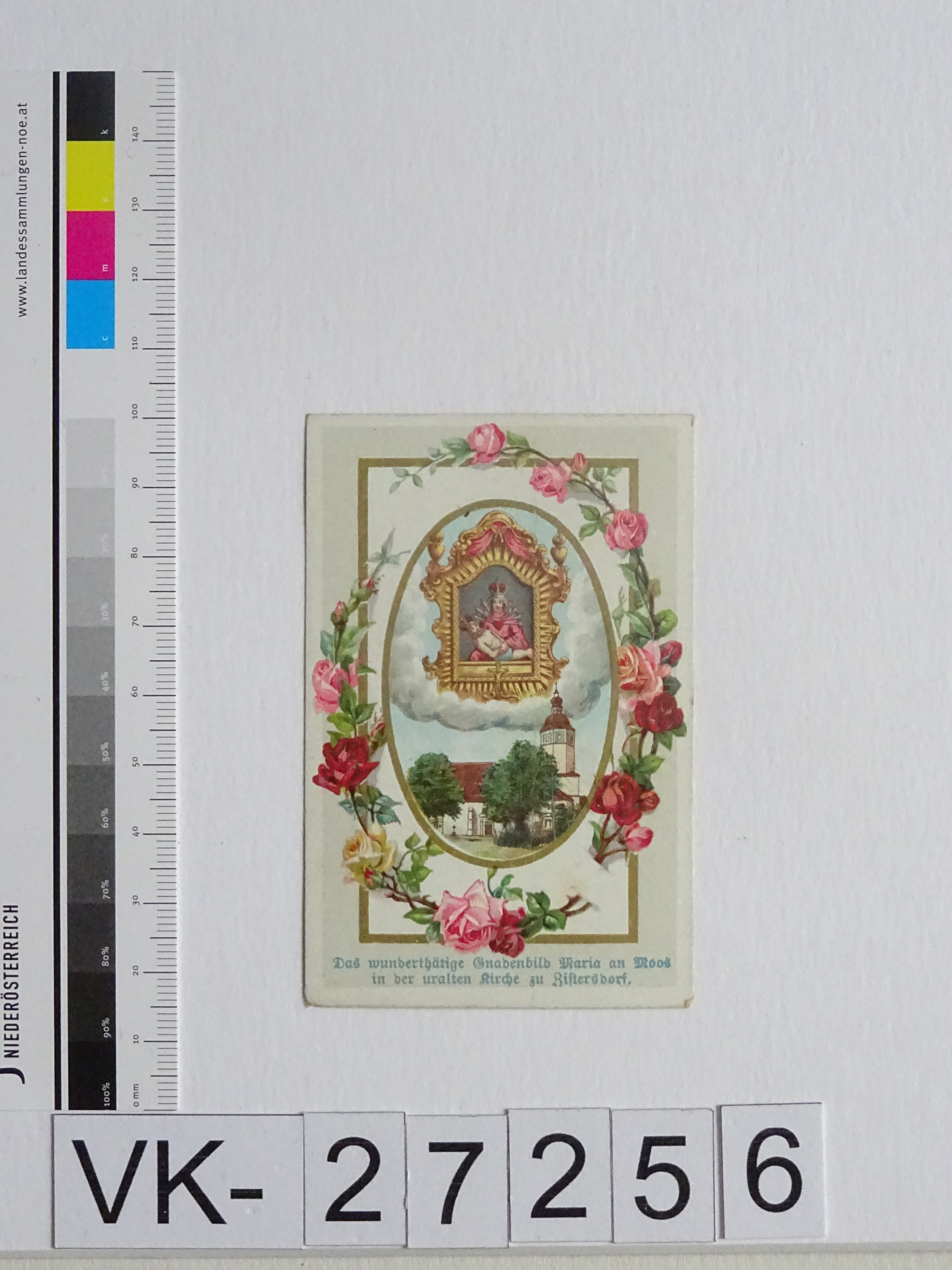 Zistersdorf, "Maria Moos"; Vorderseite: Gnadenbild = Pietà, Wallfahrtskirche; Rückseite: "Gebet", handschriftlich "Maria Moos, NÖ/ 1K40", "Verlag F. J. Schadek, Wien"