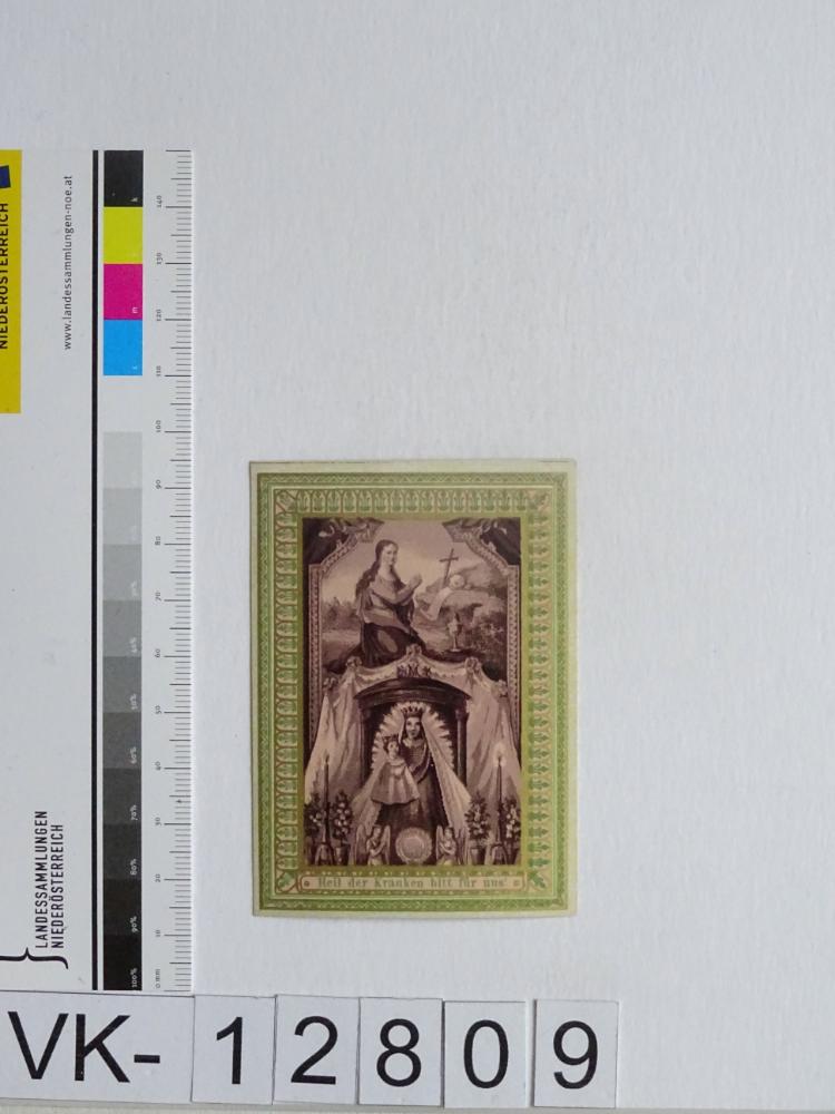 Maria Enzersdorf, "Maria Heil der Kranken"; Vorderseite: Gnadenstatue = Maria mit Kind, Maria Magdalena (Büßerin); Rückseite: "Gebet", "Verlag von G. Fischer, Innsbruck"
