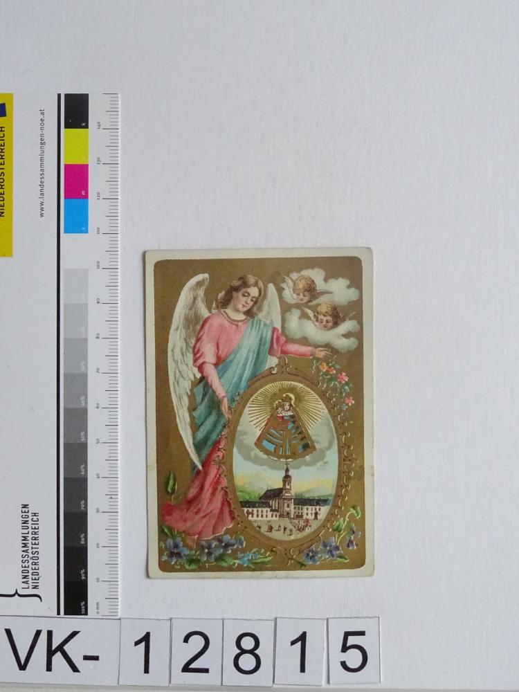 Maria Enzersdorf, "Maria Heil der Kranken"; Vorderseite: Gnadenstatue = Maria mit Kind, Wallfahrtskirche, Blumen (Veilchen); Rückseite: "Gebet", "Druckerlaubnis Bamberg 1903, Franz Schemm, Nürnberg"
