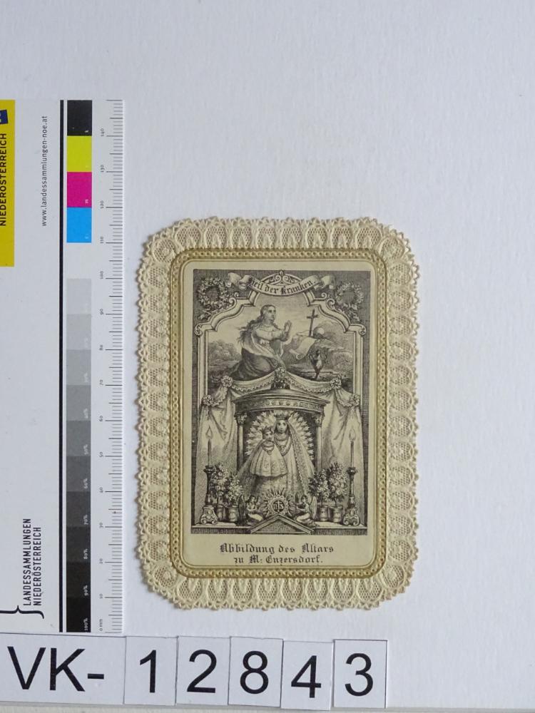 Maria Enzersdorf, "Maria Heil der Kranken"; Vorderseite: Gnadenstatue = Maria mit Kind, Maria Magdalena (Büßerin); Rückseite: Gebet "Gnadenreiche Mutter Jesu", "Bei A. Schaufele, Stuttgart"