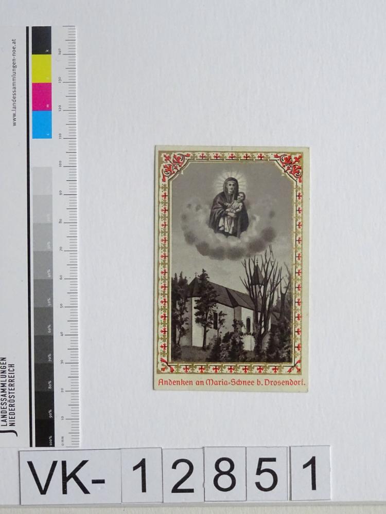 Drosendorf, Maria Schnee / Maria-Schnee-Bründl; Vorderseite: Gnadenbild = Maria mit Kind, Wallfahrtskirche; Rückseite: "Gruß an Maria", "Verlag von Gregor Fischer, Innsbruck", handschriftlich "für Meine xxx (Name unleserlich), 30. Juli 1911"