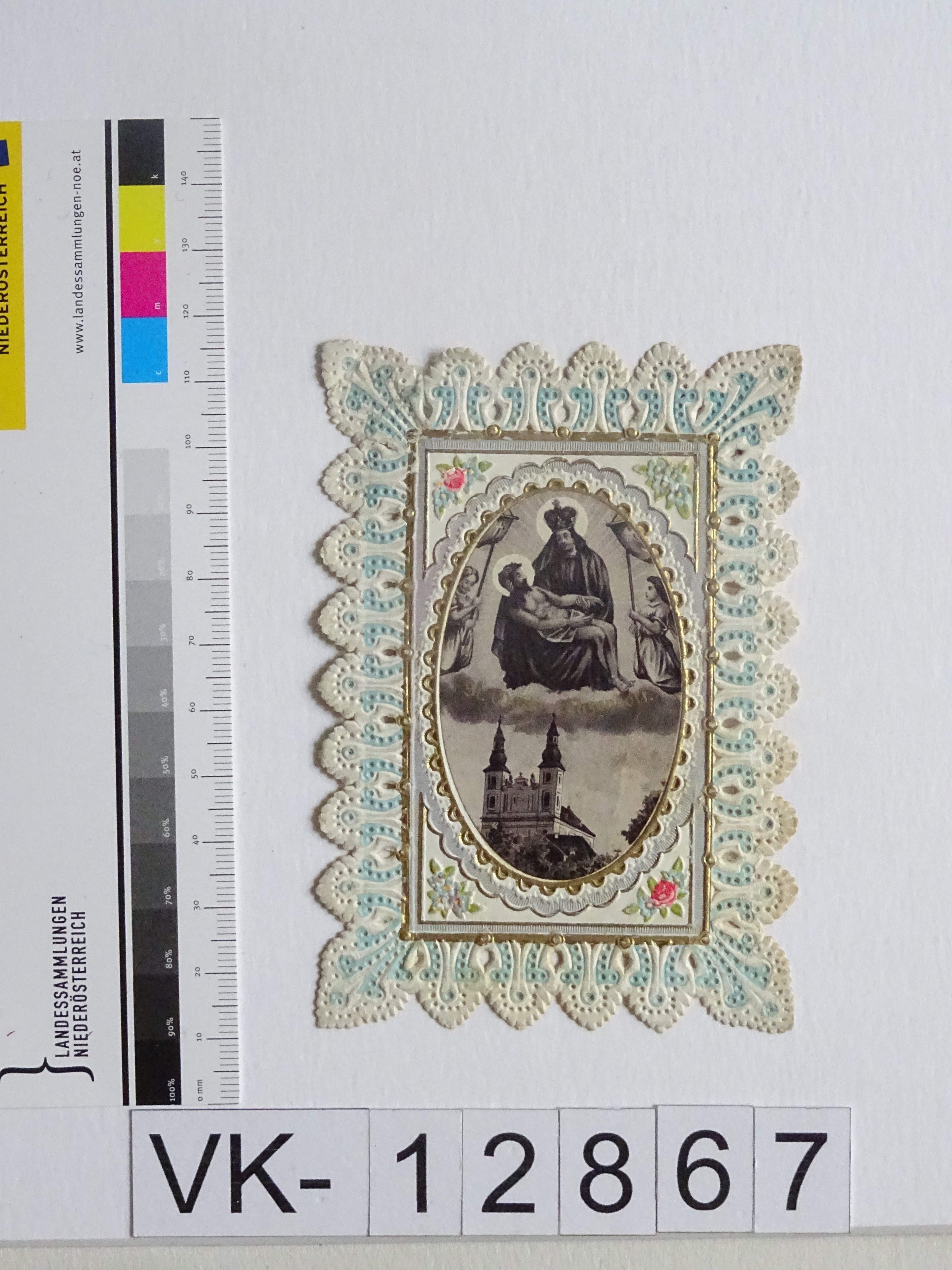 Maria Lanzendorf, "Sieben Schmerzen Mariens" Vorderseite: Gnadenstatue = Pietà, Wallfahrtskirche, Blumen (Rosen); Rückseite: Gebet