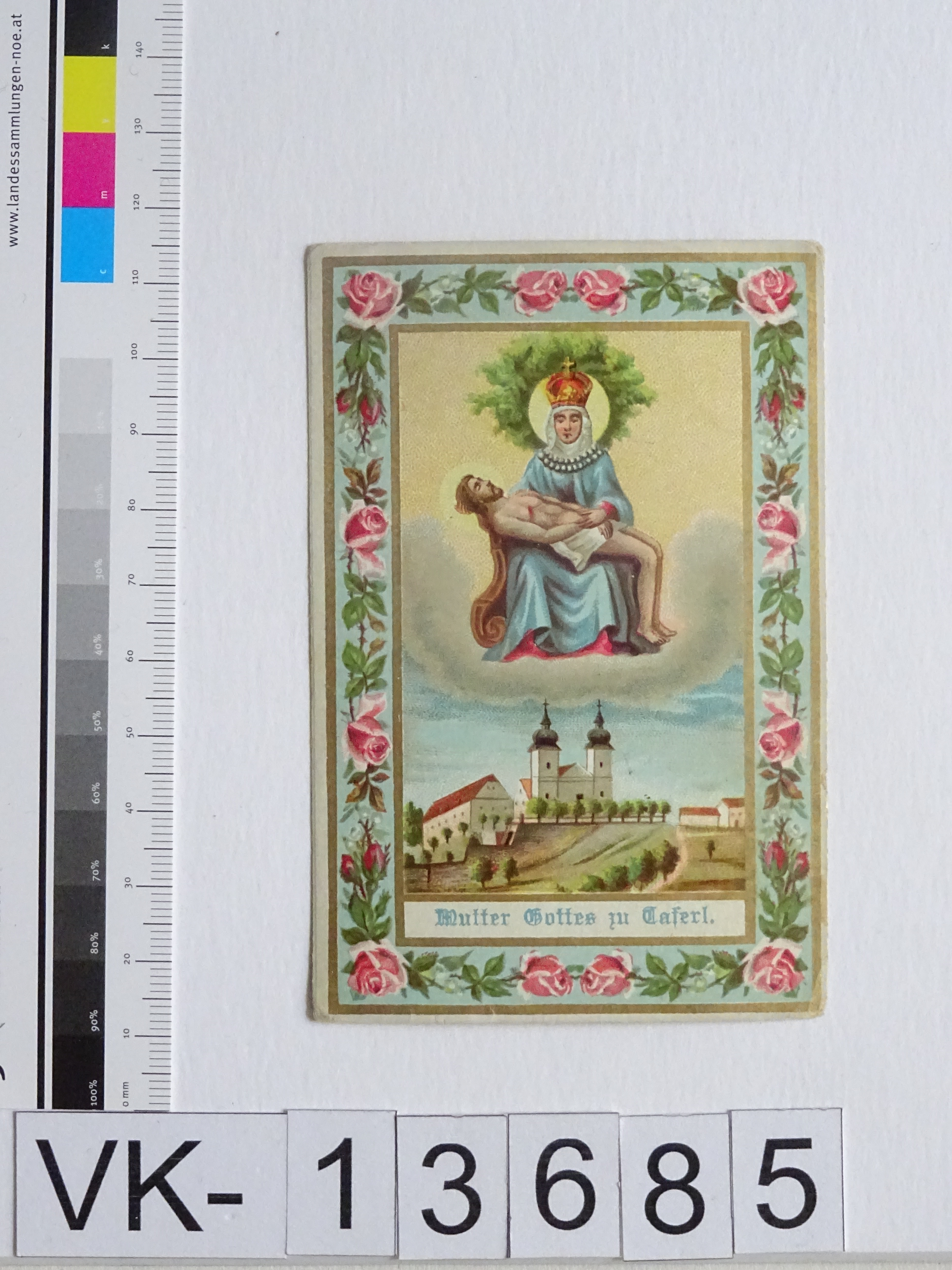 Maria Taferl; Vorderseite: Gnadenstatue = Pietà, Basilika, Blumen (Rosen); Rückseite: "Gebet", "handschriftlich "Fräulein Magi Heinbrück, 22.7.1900", "Verlag von Gregor Fischer, Innsbruck"
