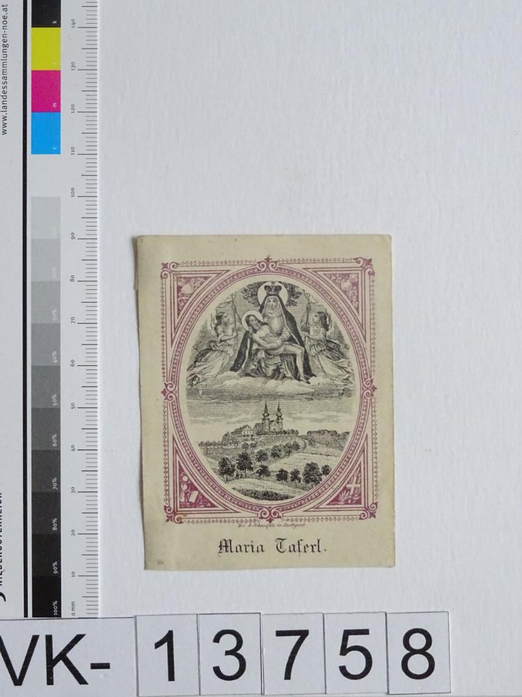 Maria Taferl; Vorderseite: Gnadenstatue = Pietà, Basilika, Engel; Rückseite: Gebet, "Bei A. Schaufele, Stuttgart", monogrammiert "FW"