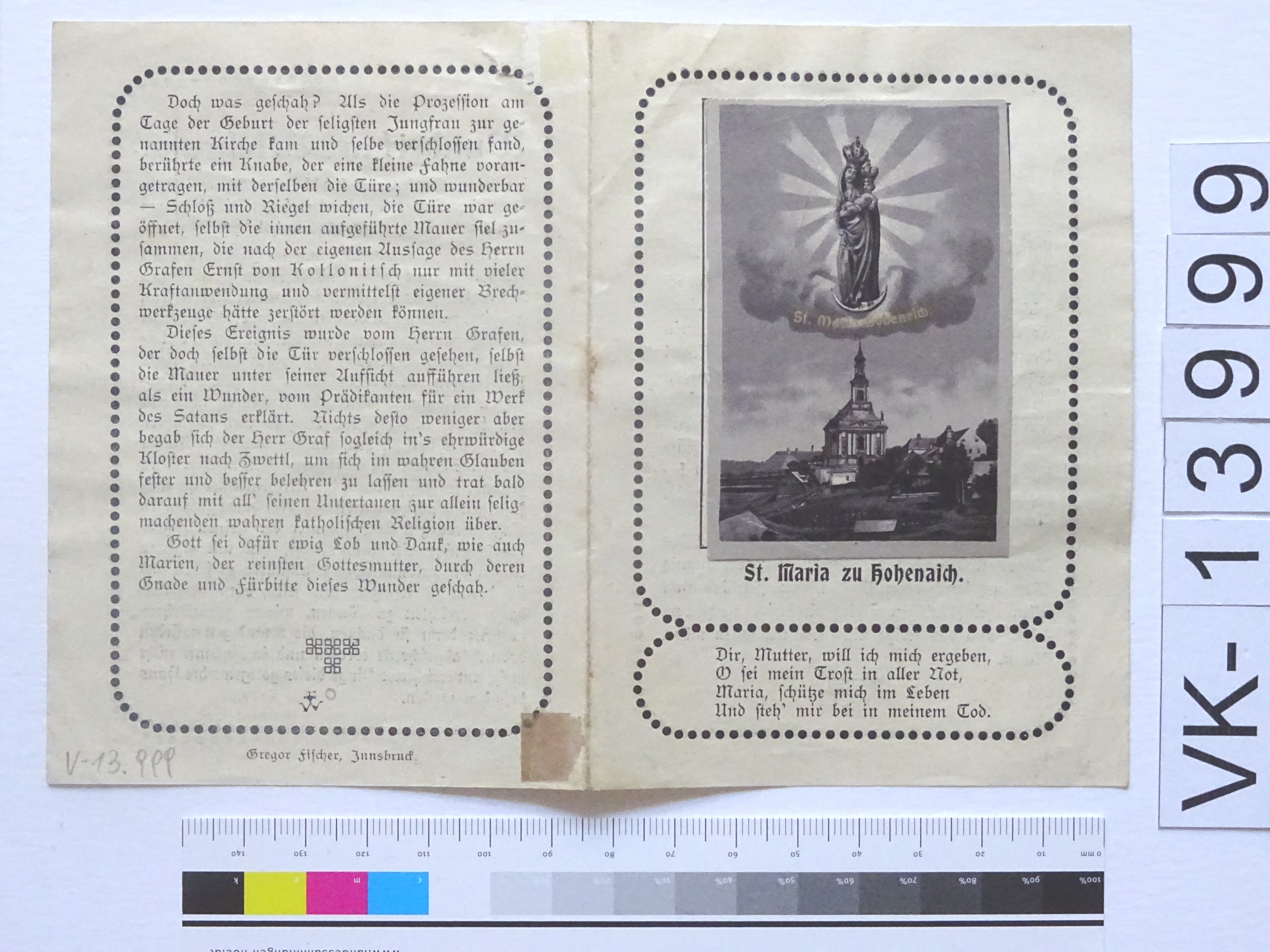 Hoheneich; gefaltet: Vorderseite: Gnadenstatue = Maria mit Kind; Wallfahrtskirche, Spruch; Innenseiten: "Gebet zu Unseren Lieben Frau", "Wunderbare Bekehrung"; Rückseite: Textfortsetzung "Wunderbare Bekehrung", "Gregor Fischer, Innsbruck", monogrammiert "