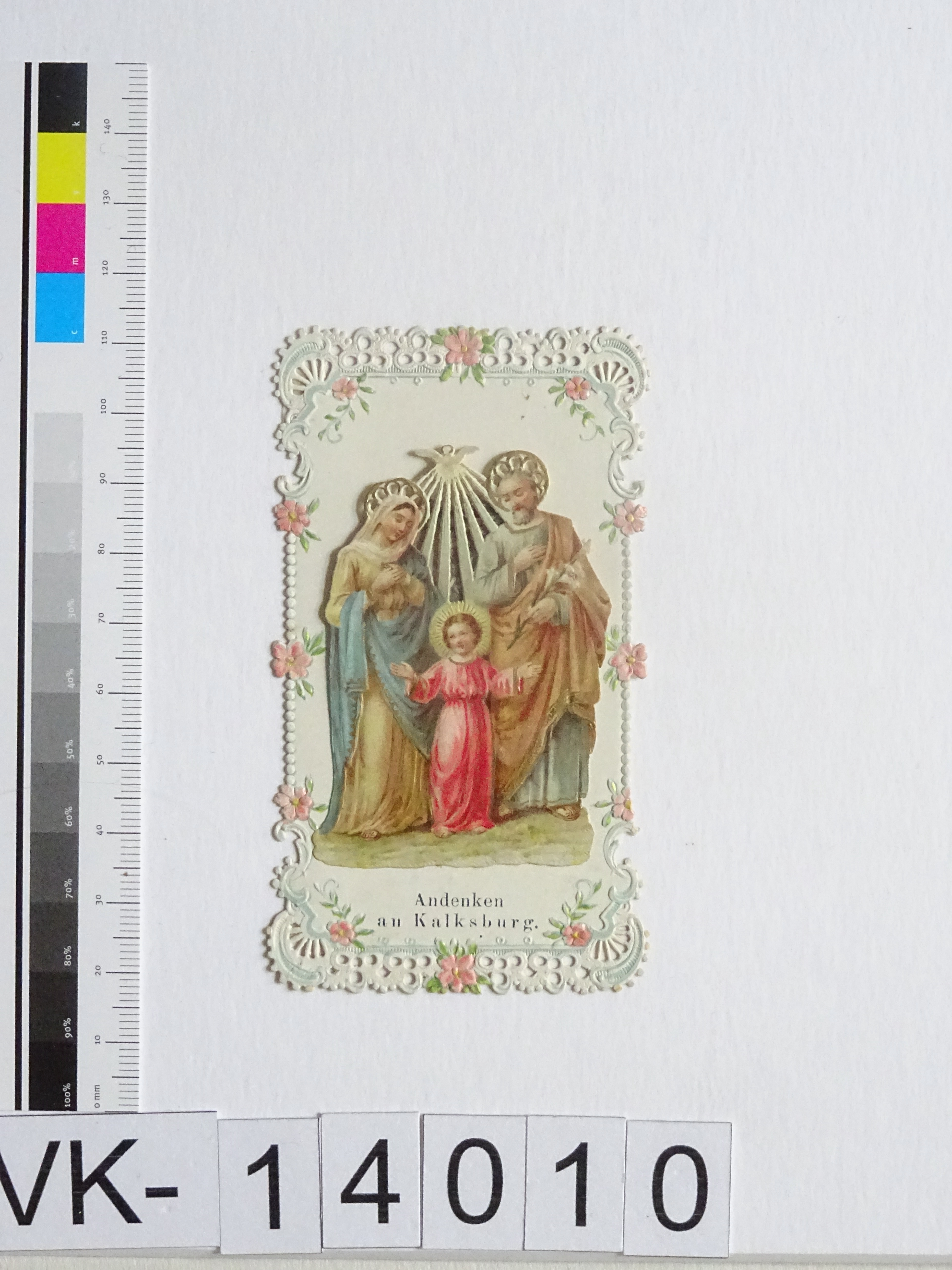Kalksburg; aufklappbar; Vorderseite: Heiliger Wandel=zum Wegklappen; Gnadenstatue = Maria mit Kind, Kruzifix; Rückseite: "Gebet", "Druck und Verlag von Franz Schemm, Nürnberg", monogrammiert "FW"