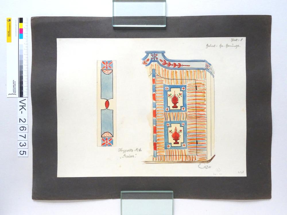 Zeichnung aus der Serie Waldviertler Heimatbilder: "Blatt 8; Gebiet Groß Gerungs, Hypolts Nr. 6 "Preiser", HZN"; Teilansicht eines bemalten Kastens; signiert, kaschiert auf Karton; 338, 35/9