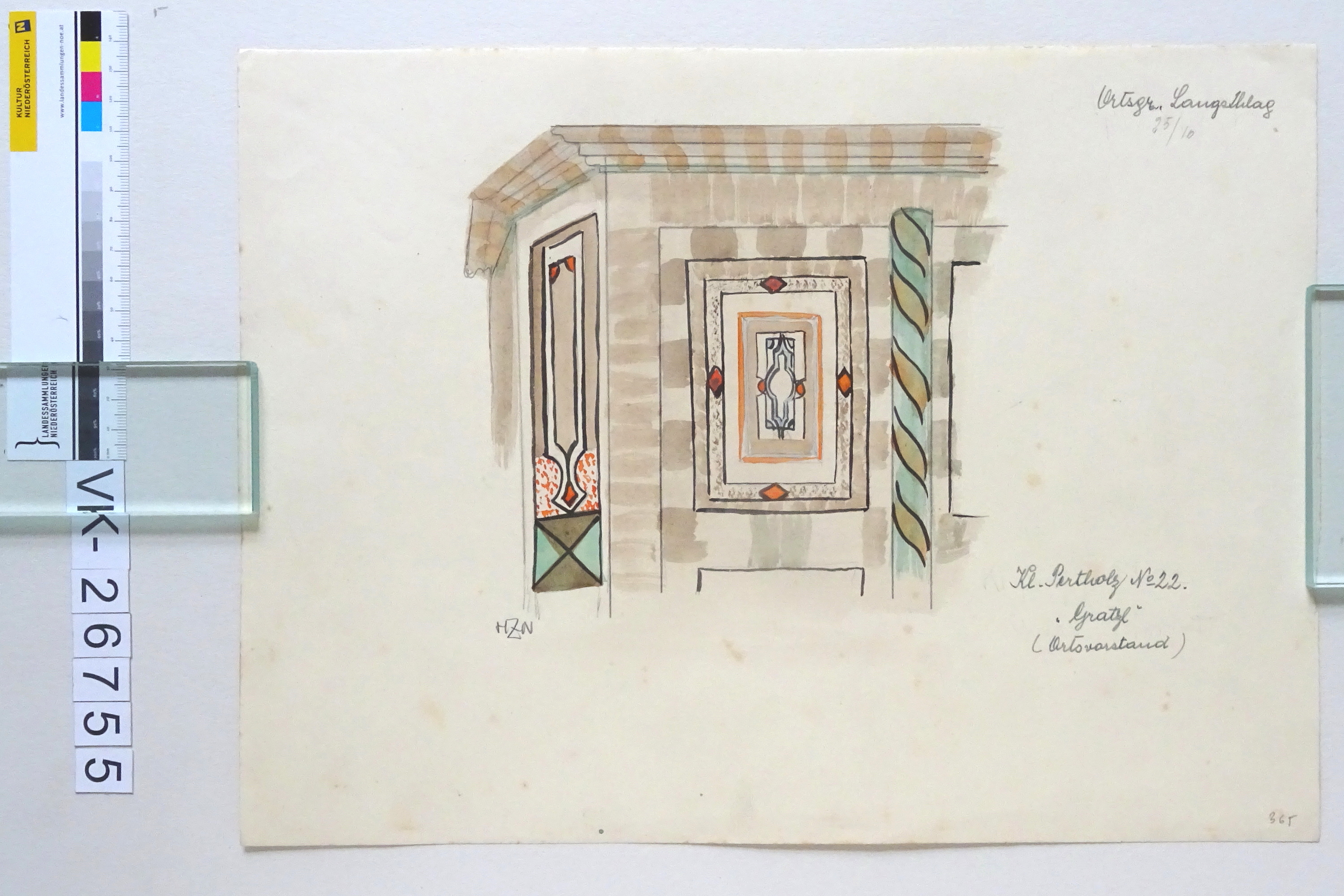 Zeichnung aus der Serie Waldviertler Heimatbilder: "Ortsgr. Langschlag, Klein Pertholz Nr. 22 "Gratzl" (Ortsvorstand); HZN"; Teilansicht eines bemalten Kastens; signiert; 365, 25/16