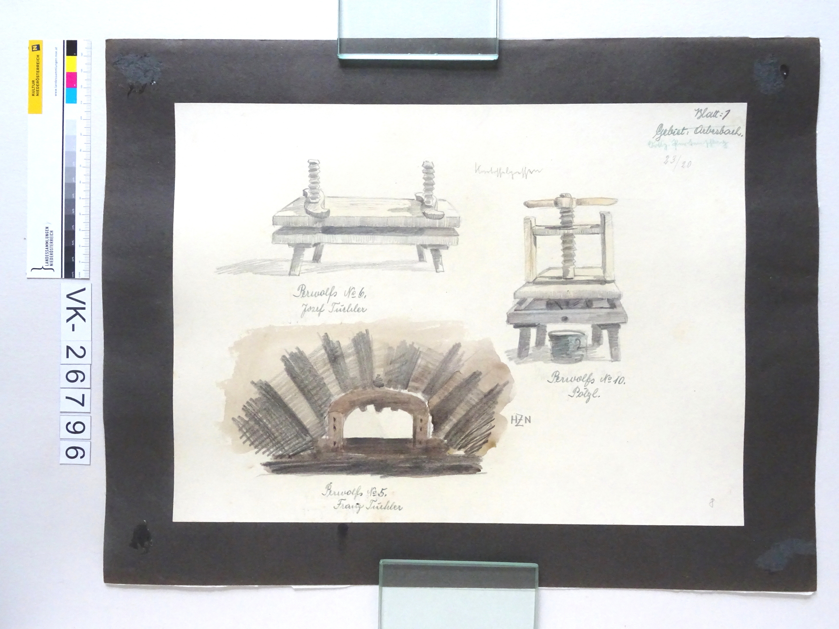 Zeichnung aus der Serie Waldviertler Heimatbilder: "Blatt 1: Gebiet Arbesbach; Perwolfs Nr. 6 Josef Tüchler; Perwolfs Nr. 10 Pölzl; Perwolfs Nr. 5 Franz Tüchler, Kartoffelpressen; "HZN"; signiert; kaschiert auf Karton; 8, 23/20