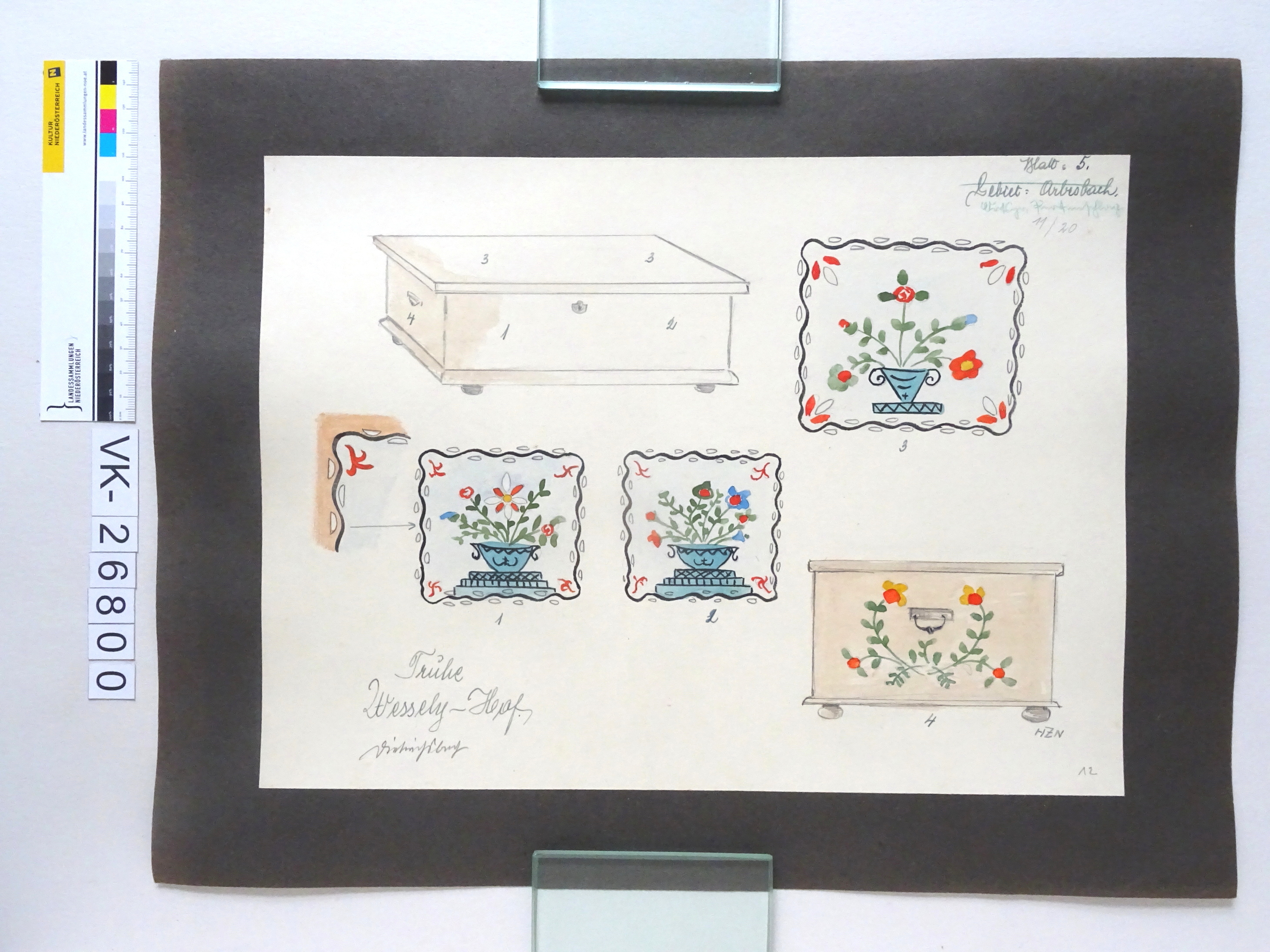 Zeichnung aus der Serie Waldviertler Heimatbilder: "Blatt 5: Gebiet Arbesbach; Truhe Wessely-Hof; "HZN"; signiert; kaschiert auf Karton; Dietrichsbach Nr. 1, bemalte Truhe; 12, 11/20