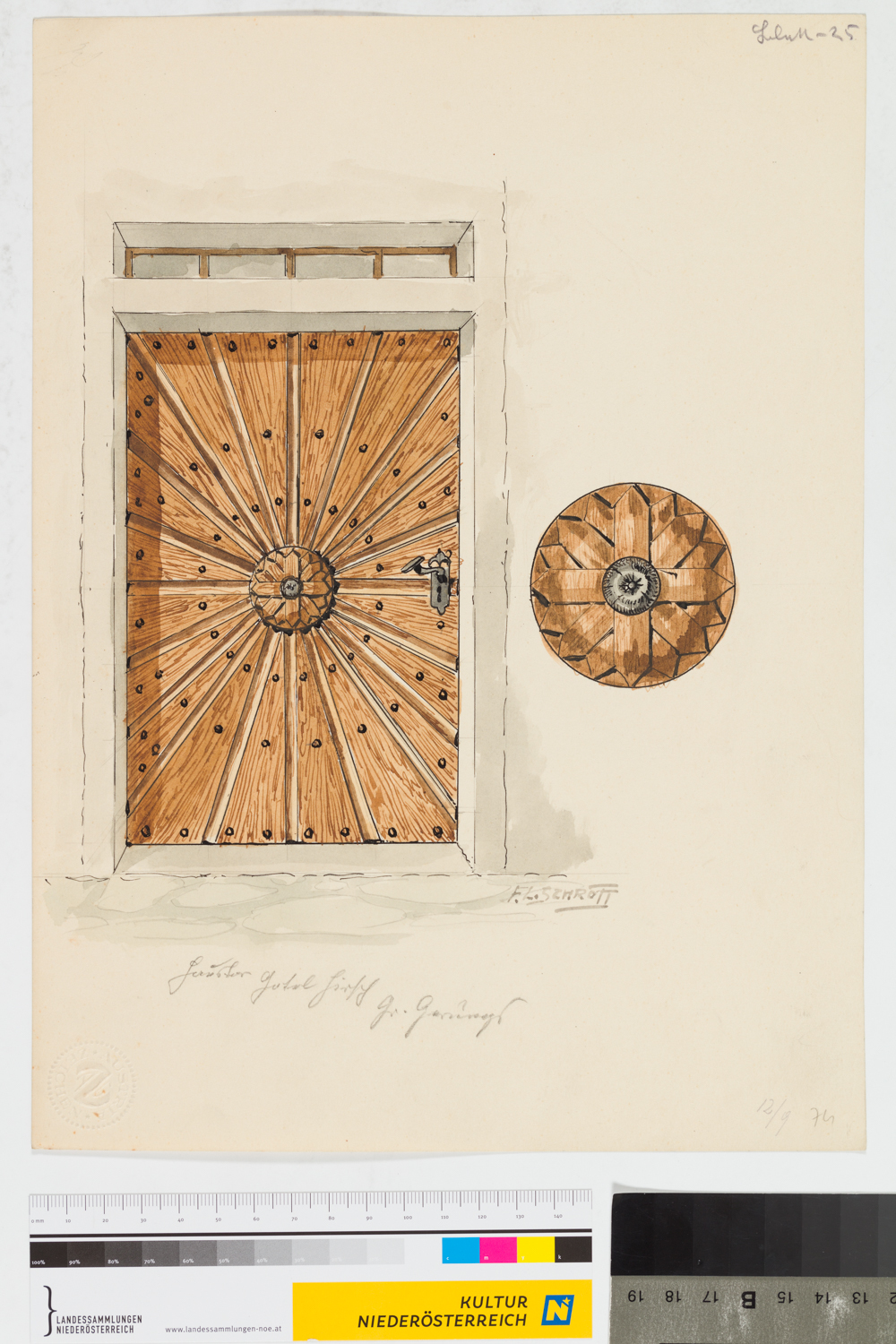 Zeichnung aus der Serie Waldviertler Heimatbilder: "Blatt 25: Groß Gerungs "Hotel Hirsch": Haustür; F.L.Schrott"; signiert; Sonnentür, Sonnensymbol; 74, 12/9