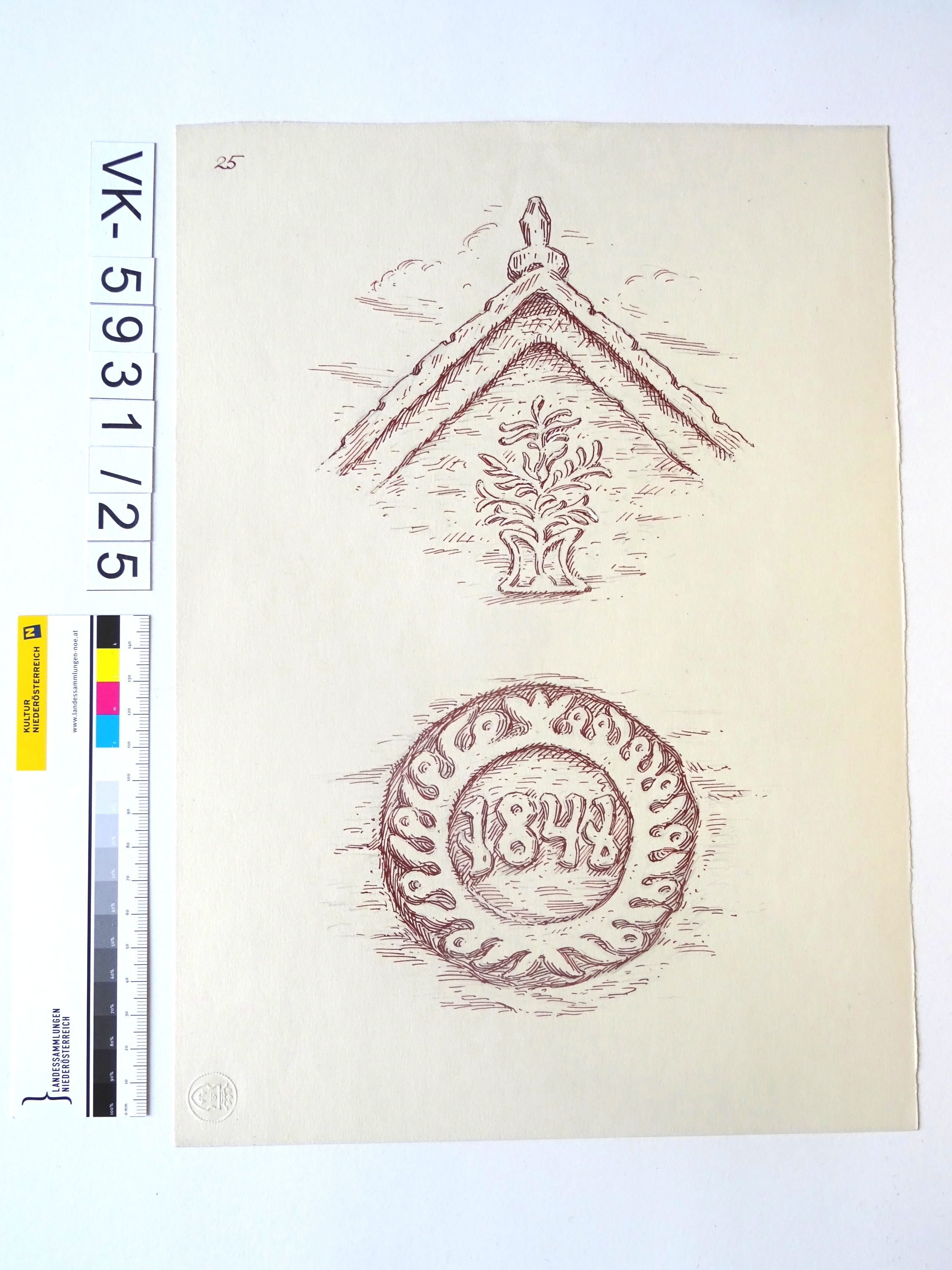 Zeichnung aus der Serie Waldviertler Heimatbilder: "Blatt 25: Stuckverzierung am Haus: oben: Lebensbaum am Hausgiebel, Friedersbach; unten: Lebenskranz mit 12 Blüten, etwa 3/4 m Durchmesser, zwischen den Fenstern des Hauses, Friedersbach"; "1848"