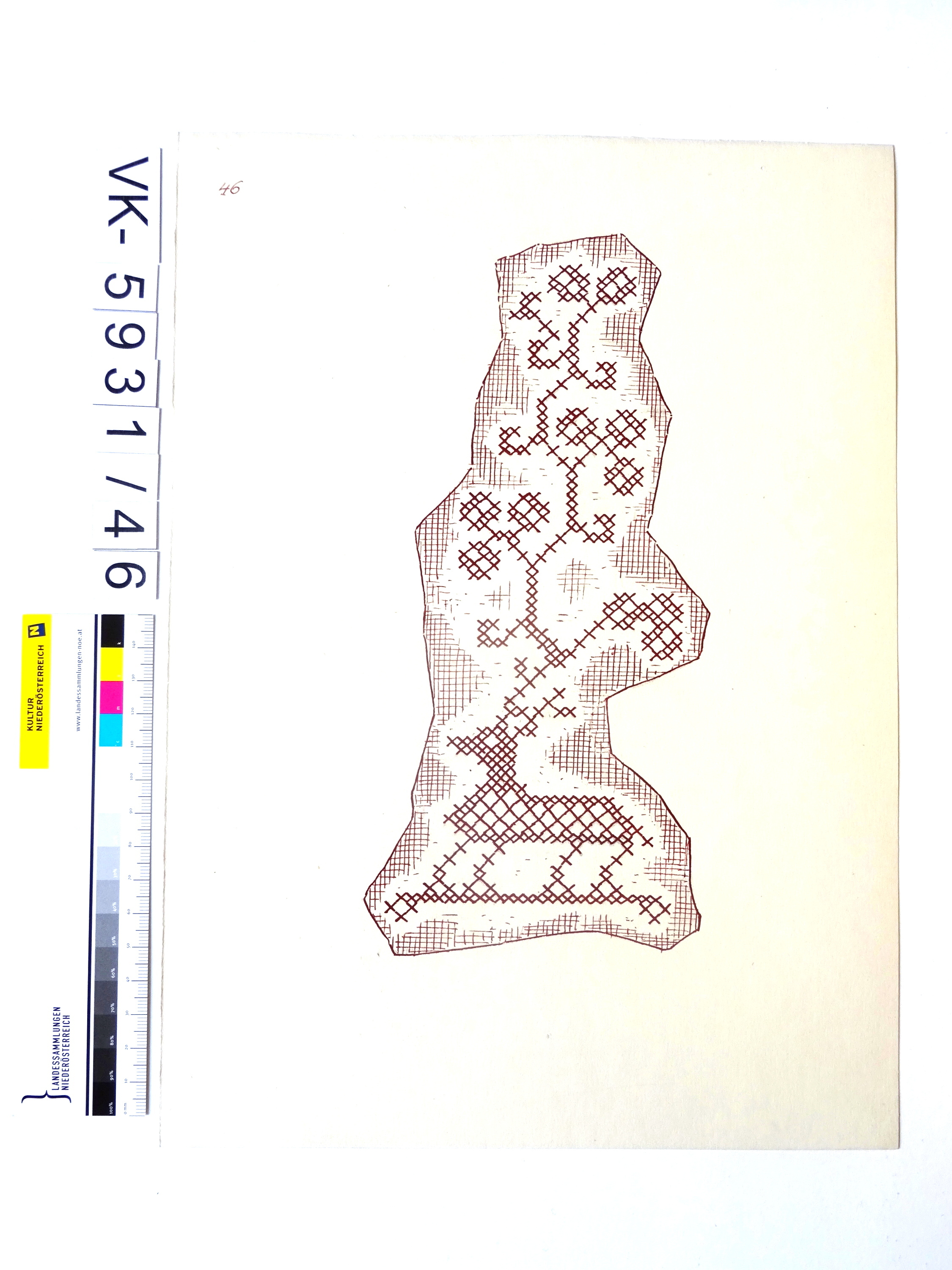 Zeichnung aus der Serie Waldviertler Heimatbilder: "Blatt 46: Kreuzstickerei-Motiv: Hirsch mit Lebensbaum im Geweih, von einem "Merkfleck"