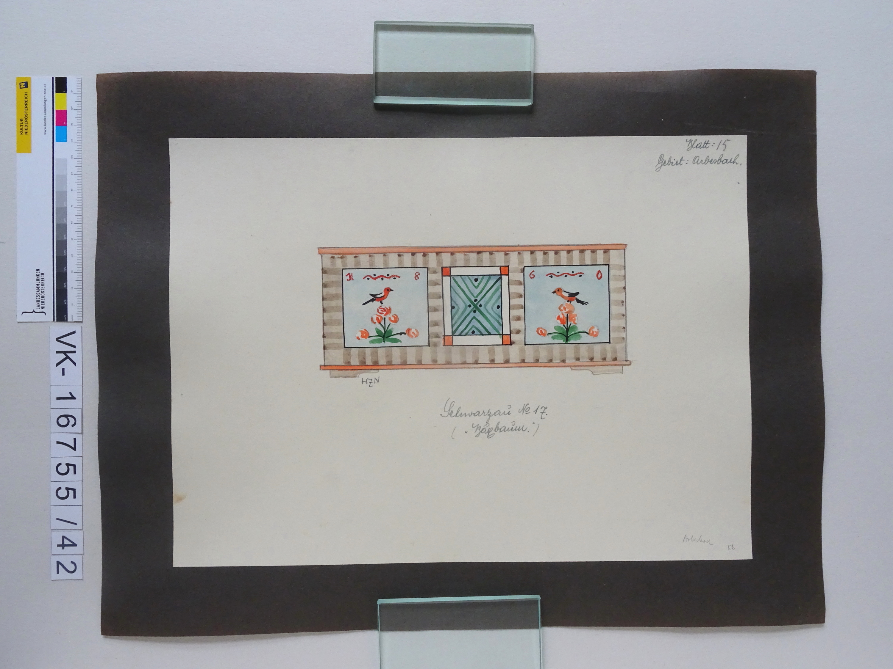 Zeichnung aus der Serie Waldviertler Heimatbilder: "Blatt 15: Gebiet Arbesbach, Schwarzau Nr. 17 "Buxbaum", 1860, HZN"; bemalte Truhe (Dreisproß, Vogel, Jahreszahl); signiert, kaschiert auf Karton; 56, 37/4