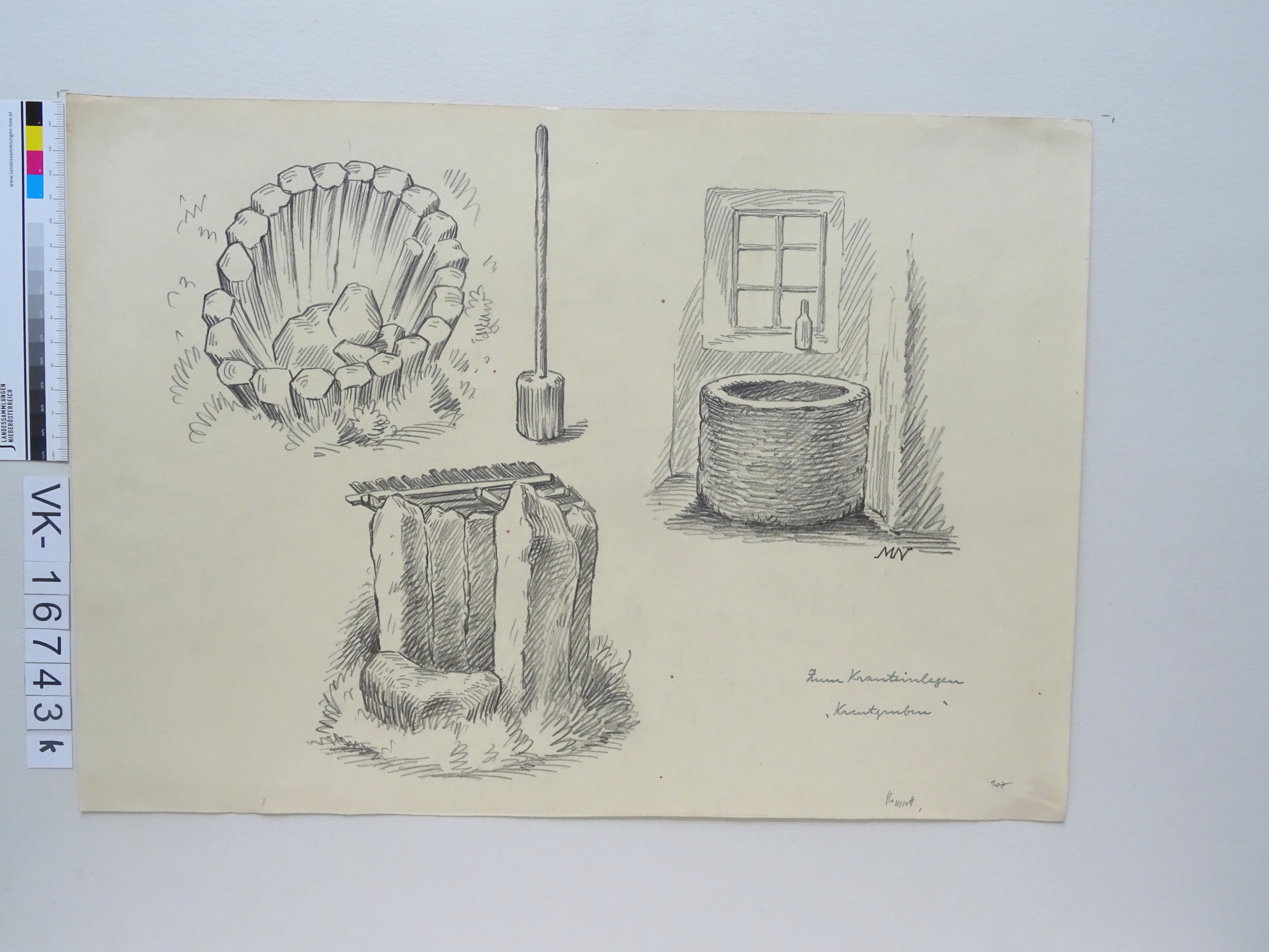 Zeichnung aus der Serie Waldviertler Heimatbilder: "Rappottenstein, "Zum Krauteinlegen Krautgruben", links oben Krautgrube aus Baumstämmen (1 m über, 2 m unter der Erde), rechts oben Krautbottich aus Granit, unten Krautgrube aus Granitblöcken (1 m über, 2 m unter der Erde, schindelgedeckt) = zum Einlegen des sogenannten "Grubkrautes" = bestes Sauerkraut"; MN"; Krautgrube, Steinfaß; signiert; 207