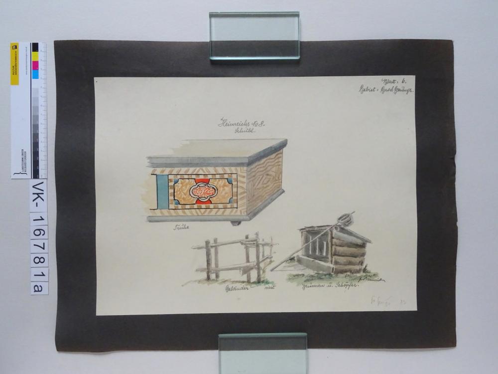 Zeichnung aus der Serie Waldviertler Heimatbilder: "Blatt 6: Gebiet Groß Gerungs; Heinreichs Nr. 8 "Schübl", Truhe, Geländer mit Brunnen und Schöpfer; Hans Neumüller"; signiert, kaschiert auf Karton; Teilansicht einer bemalten Truhe (Vierpass); 83, 60/9