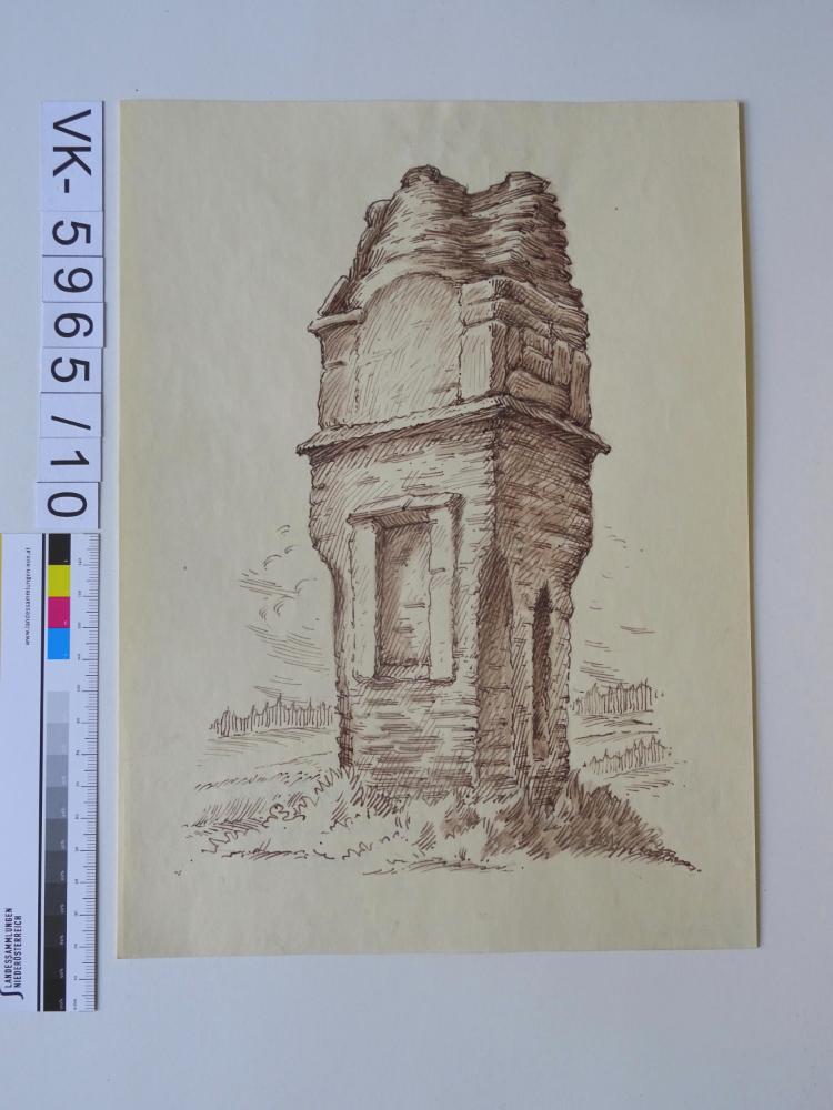 Zeichnung aus der Serie Waldviertler Heimatbilder: "Alte Richtstätte, Galgenkreuz bei Zwettl; MN", signiert