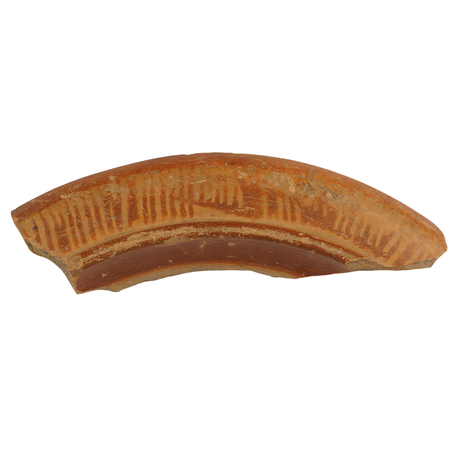 Randfragment einer Reibschüssel mit überhängendem gewölbtem Kragenrand. Der Gefäßkörper wird durch einen stegartigen Wulst vom Kragenrand getrennt. Der Rand ist an der Oberseite mit rotbraunen Streifen verziert, Steinchenbewurf an der Innenseite. Die Innenseite weist einen in rotbraun gehaltenen Überzug auf. Oxidierend gebrannte Keramik.