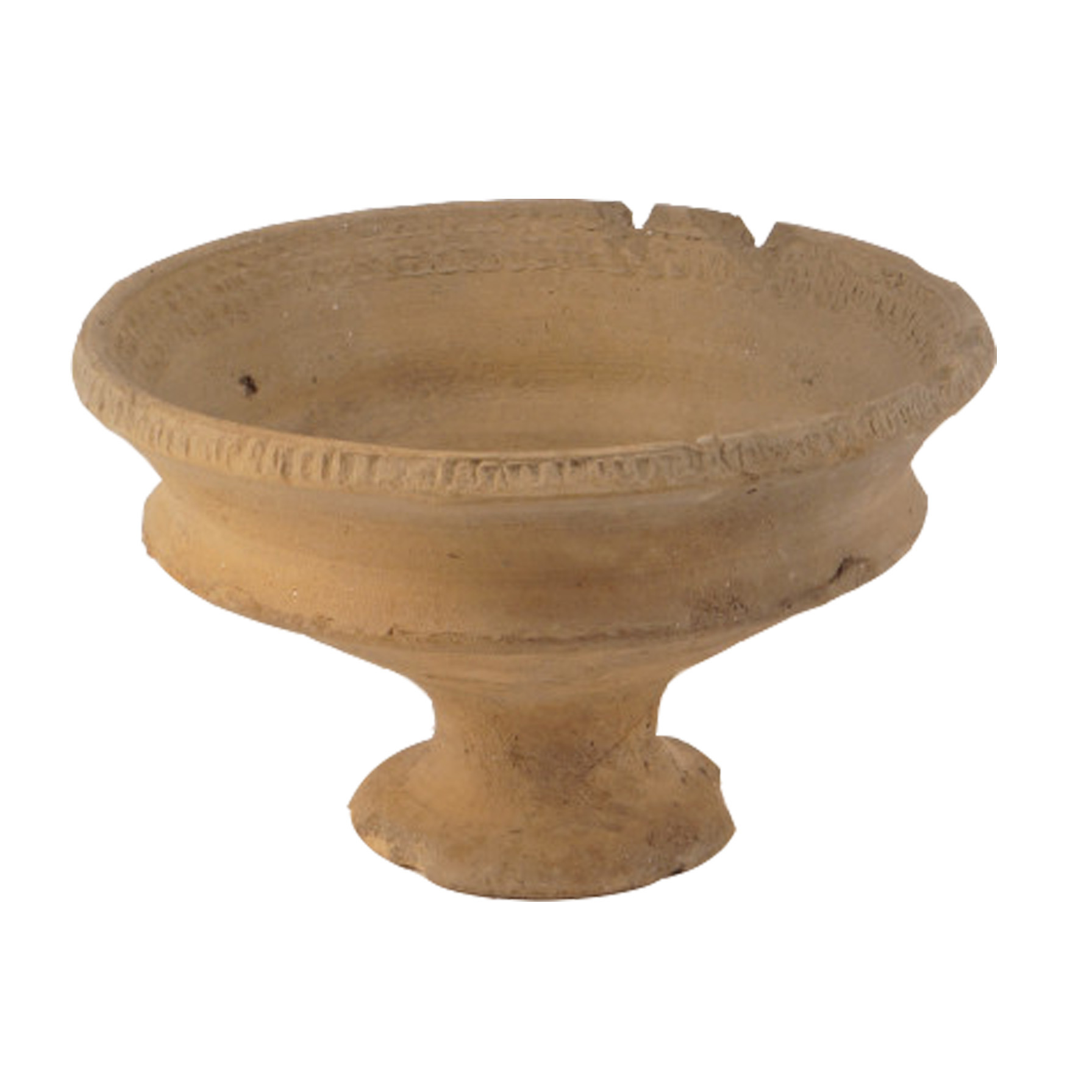 Ganzform einer Räucherschale mit Dreiecksrand. Scharfer Wandknick, mäßig hoher Standfuß. Oxidierend gebrannte Keramik.
