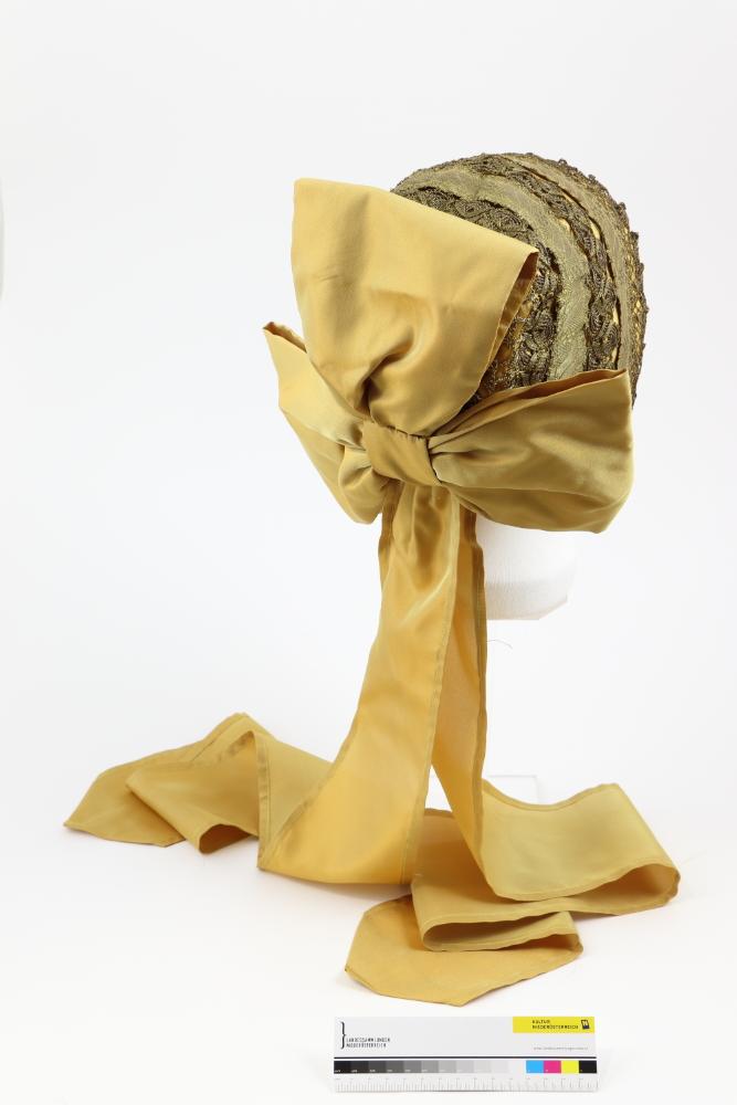 Bodenhaube, Kopfteil mit Goldborten und Klöppelspitzen besetzt und gelb unterlegt. Über den Haubenboden ist ein gehäkeltes Netz aus Goldfäden gearbeitet. Der Haubenrand ist mit einer weißen Spitze eingefaßt. Die Masche im Nacken hat eine dritte Schleife die über den Haubenboden ragt und lange, abgesteppte Bänder in Gelb. Die Haubbe ist mit weißem Leinen gefüttert.