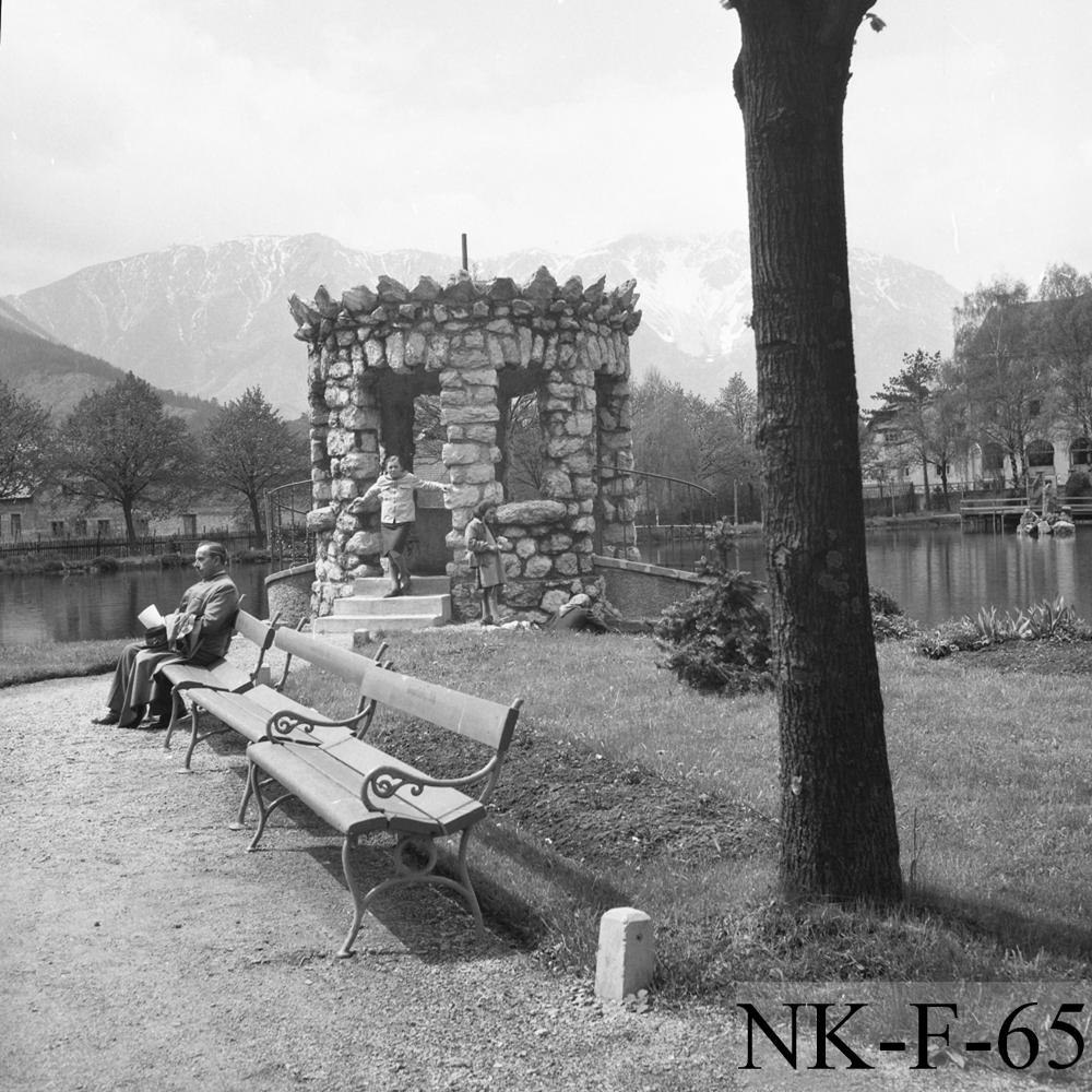 Puchberg am Schneeberg, Puchberg mit Schneeberg und kitschigem Gebäude und Erholungssuchenden auf Parkbänken