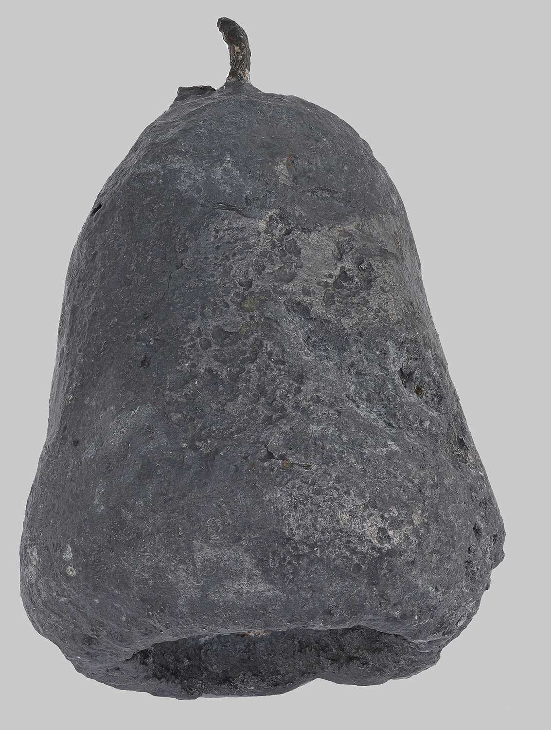 Glockenförmiger Körper aus Blei; oben Öse aus Eisen; unten konkav mit Loch in der Mitte