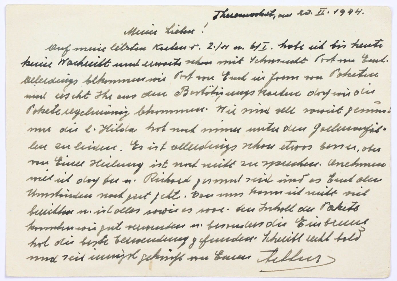 Auf meine letzten Karten v. 2./11 u. 6./I habe ich bis heute keine Nachricht und erwarte schon mit Sehnsucht Post von Euch. Allerdings bekommen wir Post von Euch in Form von Paketen und erseht Ihr aus den Bestätigungskarten doch wir die Pakete regelmässig bekommen. Wir sind alle soweit gesund und die l. Hilda hat noch immer unter der GallenX zu leiden. Es ist allerdings schon etwas besser, aber von einer Heilung ist noch nicht zu sprechen. Annehmen will ich doch du u. Richard gesund seid und es Euch allen Umständen noch gut geht. Von uns kann ich nicht viel berichten u. ist alles sowie es soll. Den Inhalt des Pakets konnten wir gut verwenden u. besonders die Einbrenn hat die beste Verwendung gefunden. Schreibt recht bald und seit innigst geküsst von Eurem Arthur.