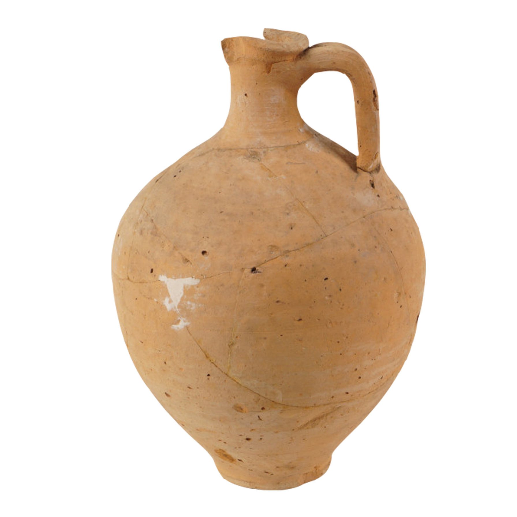 Geklebte und ergänzte Ganzform einer einhenkeligen Kanne. Schmaler Hals, Bandhenkel, bauchige Gefäßwandung, leicht abgesetzte plane Standfläche. Geglättete Oberfläche? Oxidierend gebrannte Keramik.