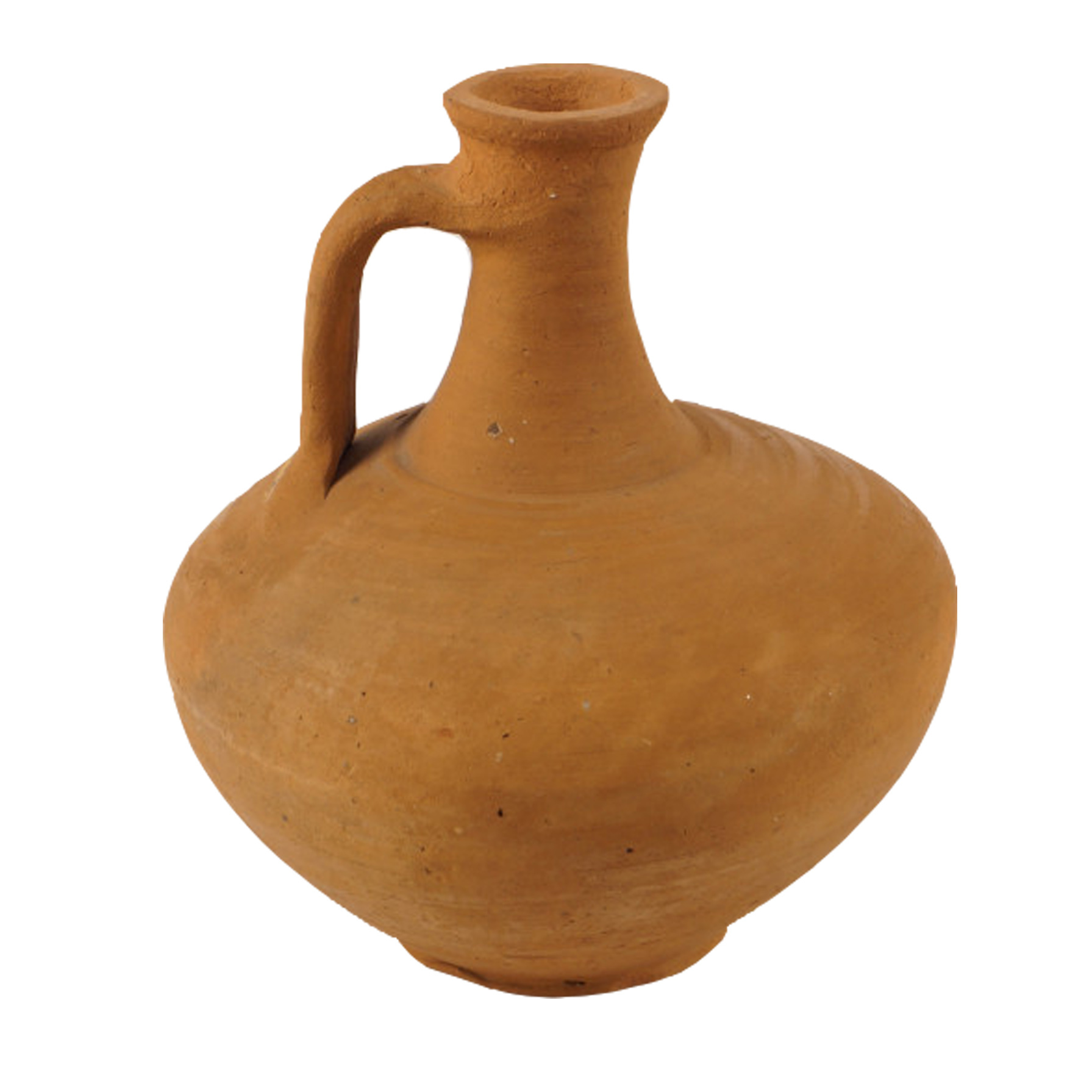 Ganzform eines einhenkeligen Kruges mit horizontalem Rand. Schmaler, langer Hals, Bandhenkel, linsenförmiger Körper, leicht abgesetzte gerillte Standfläche. Oxidierend gebrannte Keramik.