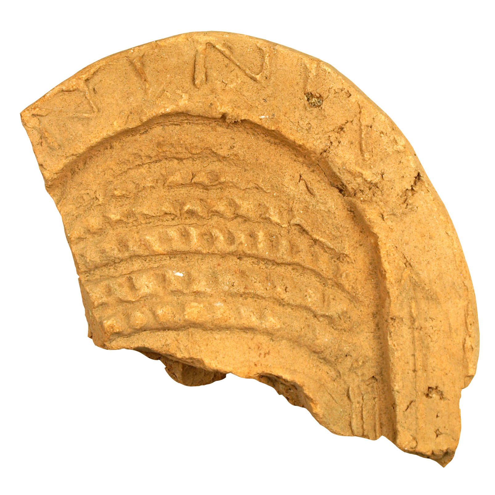 Fragment eines Stirnziegels mit der Darstellung einer Maske, von welcher lediglich der Haarteil erhalten geblieben ist. Auf dem breiten, glatten Rahmen ist der rudimentär erhaltene Schriftzug ]NINIVS zu lesen.